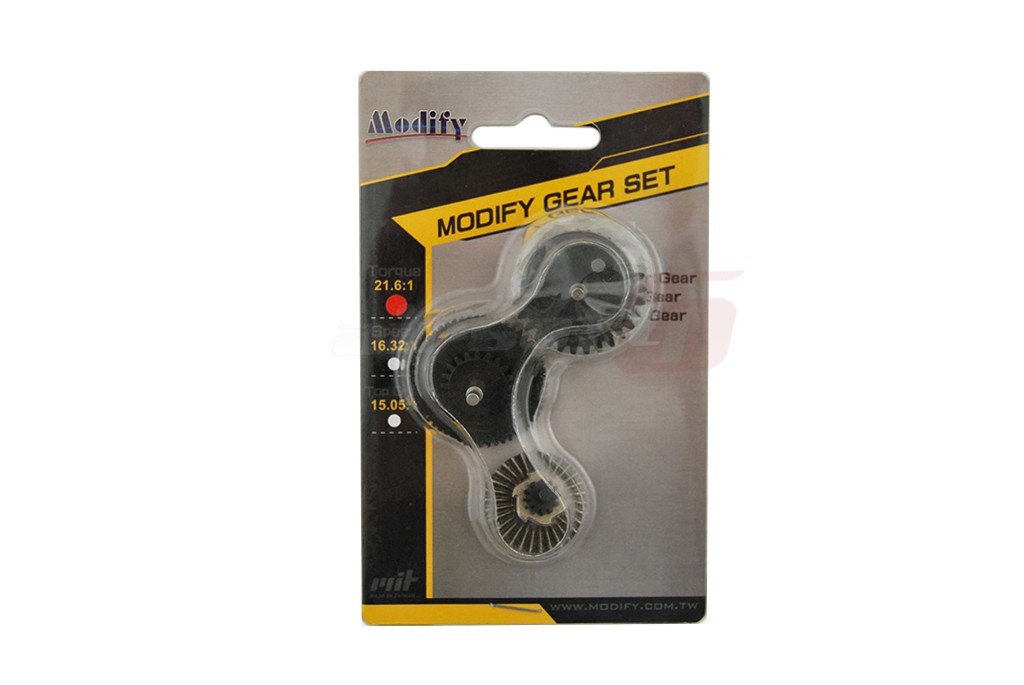 Roti high torque marca Modify. Fabricate din otel de calitate, aceste roti au un raport de 21.6 - 1 obtinand cu aceleasi turatii ale motorului existent o cadenta de tir mai mica dar cu o putere mai mare de incordare a pistonului. Astfel, daca un motor normal intampina dificultati in a incorda un arc de 120-130 m/s odata montat acest set de roti, motorul va functiona mai lejer castigand randament.