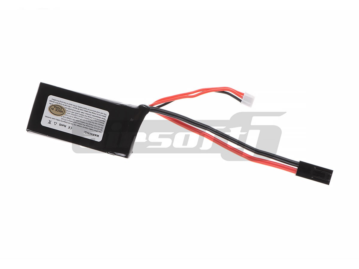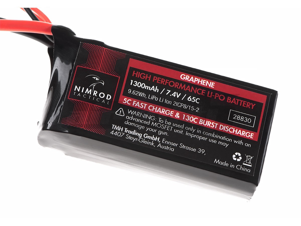 Acest acumulator Nimrod este de tip LiPo si este compus din 2 celule ce alcatuiesc un ansamblu compact. Are o tensiune de 7.4V si o capacitate de 1300mAh. Tehologia acumulatorului permite dimensiuni foarte reduse ale intregului ansamblu, astfel montarea in spatii destinate bateriei foarte reduse. Descarcarea acumulatorului de 65C permite o furnizare de curent optima pentru necesitatea de curent a replicii.