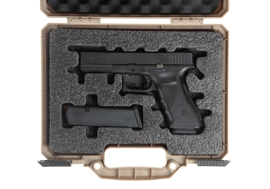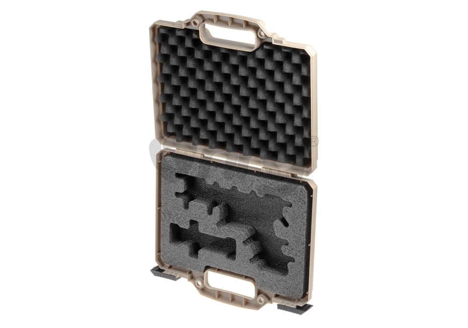 Cutie inscriptionata Nimrod Tactical, destinata transportului pistoalelor de airsoft. Aceasta cutie este fabricata din plastic si capitonala in interior cu burete moale deja decupat pentru orice pistol, pentru a putea fixa si asigura replica in timpul transportului. Cutia este asigurata cu ajutorul a doua cleme din plastic.