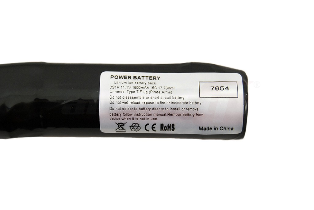 Acest acumulator Pirate Arms este de tip LiPo si este compus din 3 celule ce alcatuiesc un ansamblu compact. Are o tensiune de 11.1V si o capacitate de 1600mAh. Tehologia acumulatorului permite dimensiuni foarte reduse ale intregului ansamblu, astfel montarea in spatii destinate bateriei foarte reduse. Este destinat paturilor de tip SOPMOD. Descarcarea acumulatorului de 15C permite o furnizare de curent suficienta necesitatea de curent a replicii.