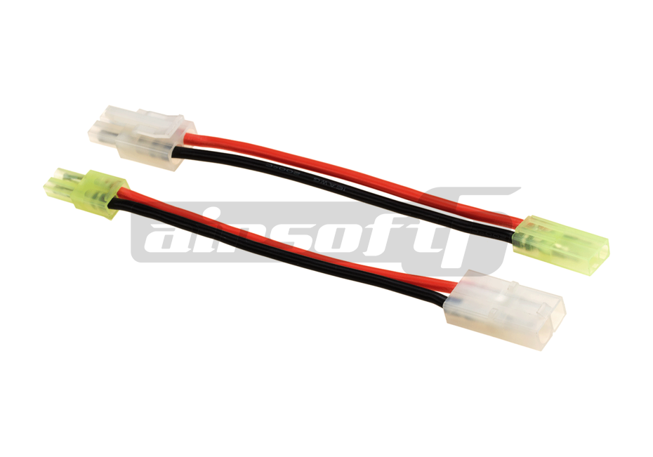 Set de 2 adaptoare pentru conexiuni Tamiya mini si Tamiya mare. Cu acest set de adaptoare vor putea fi conectati acumulatori cu mufa Tamiya mini la replicile ce au Tamiya mare si invers. Ele sunt fabricate din plastic iar cablurile sunt groase si cu protectie de silicon.