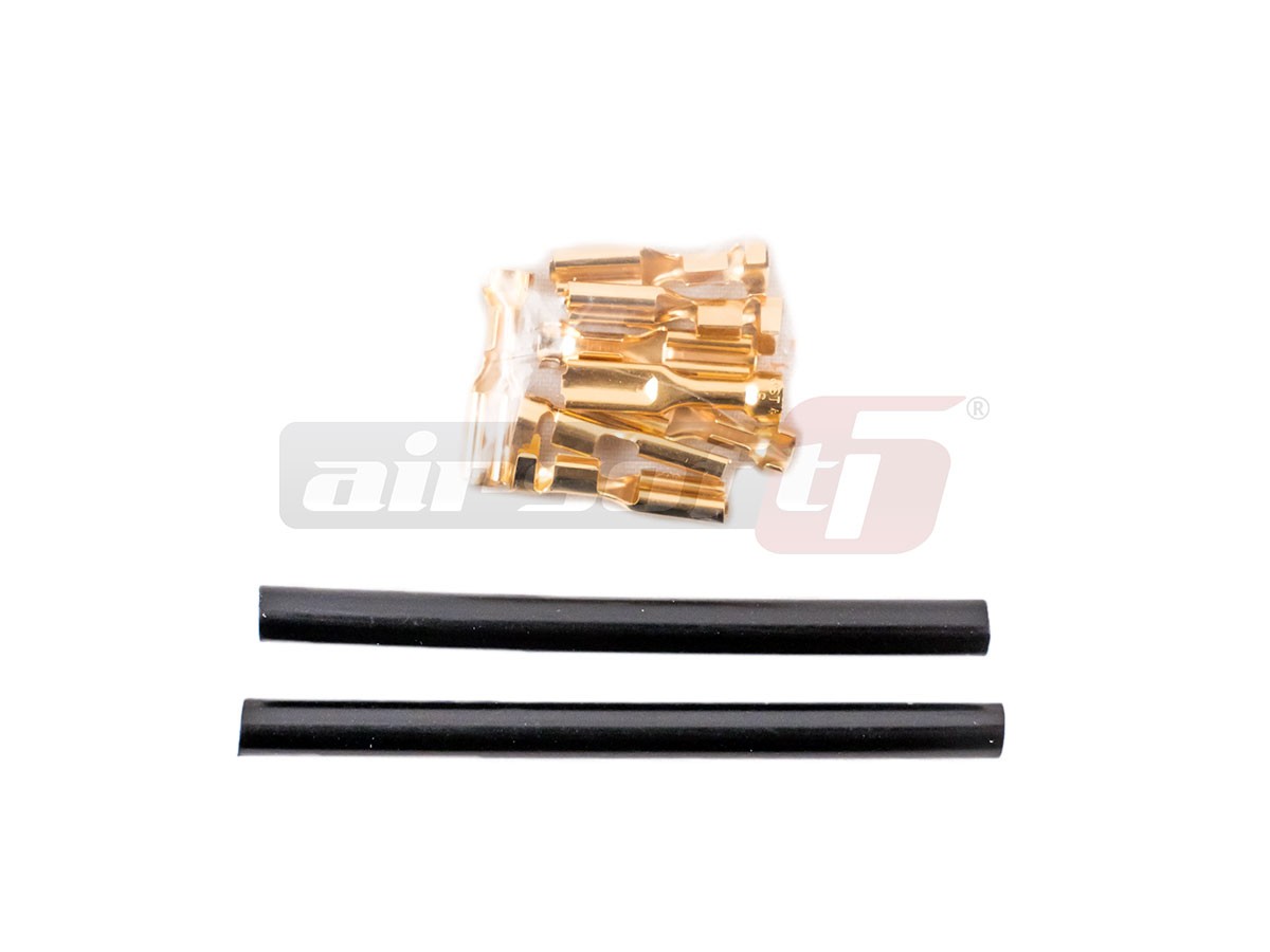 Papuci marca Prometheus pentru conectarea motorului replicilor AEG. Sunt fabricati din alama, asigurand astfel o conexiune optima in timp. In pachet sunt inlcuse tuburi termo-contractante pentru izolatie. Pachetul cuprinde 4 papuci + 2 tuburi lugi de izolatie. Se recomanda cositorirea papucilor pentru un contact superior.