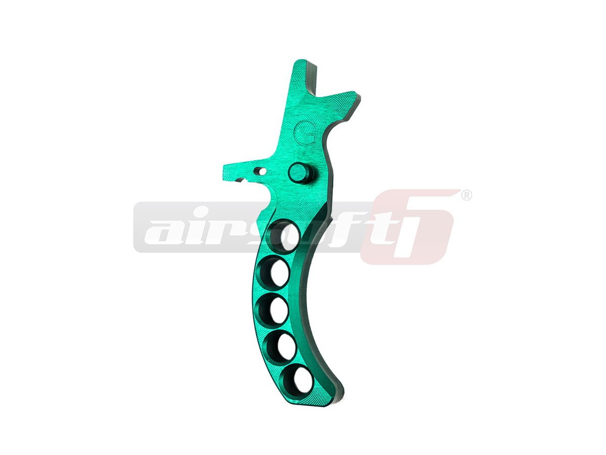 Tragaci destinat platformelor M4/M16 cu gearbox versiune 2. Aceasta componenta prezinta o rezistenta asemanatoare otelului si o greutate scazuta datorita aluminiului din care este conceput, fiind menita sa inlocuiasca piesa originala cu scopul de a mari durabilitatea in timp, de a personaliza replica intr-un mod unic si de a oferii utilizatorului un confort deosebit la actionarea tragaciului. Acest tragaci este fabricat din Aluminiu EN AW 7075 cu un strat protectiv anodizat de culoare verde.