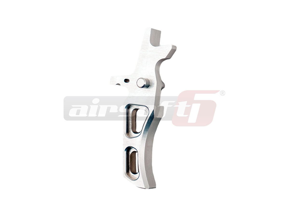 Tragaci destinat platformelor M4/M16 cu gearbox versiune 2. Aceasta componenta prezinta o rezistenta asemanatoare otelului si o greutate scazuta datorita aluminiului din care este conceput, fiind menita sa inlocuiasca piesa originala cu scopul de a mari durabilitatea in timp, de a personaliza replica intr-un mod unic si de a oferii utilizatorului un confort deosebit la actionarea tragaciului. Acest tragaci este fabricat din Aluminiu EN AW 7075 cu un strat protectiv anodizat de culoare argintie.