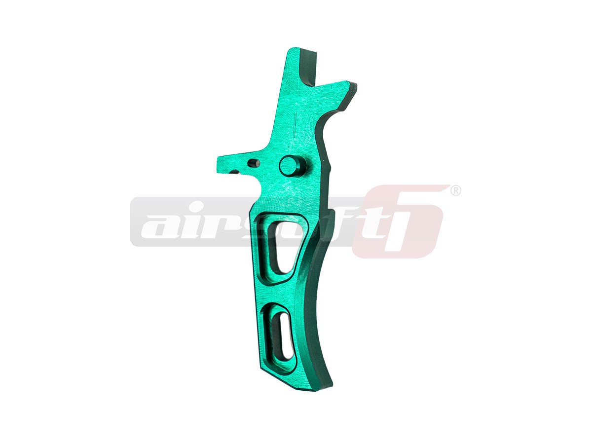 Tragaci destinat platformelor M4/M16 cu gearbox versiune 2. Aceasta componenta prezinta o rezistenta asemanatoare otelului si o greutate scazuta datorita aluminiului din care este conceput, fiind menita sa inlocuiasca piesa originala cu scopul de a mari durabilitatea in timp, de a personaliza replica intr-un mod unic si de a oferii utilizatorului un confort deosebit la actionarea tragaciului. Acest tragaci este fabricat din Aluminiu EN AW 7075 cu un strat protectiv anodizat de culoare verde.