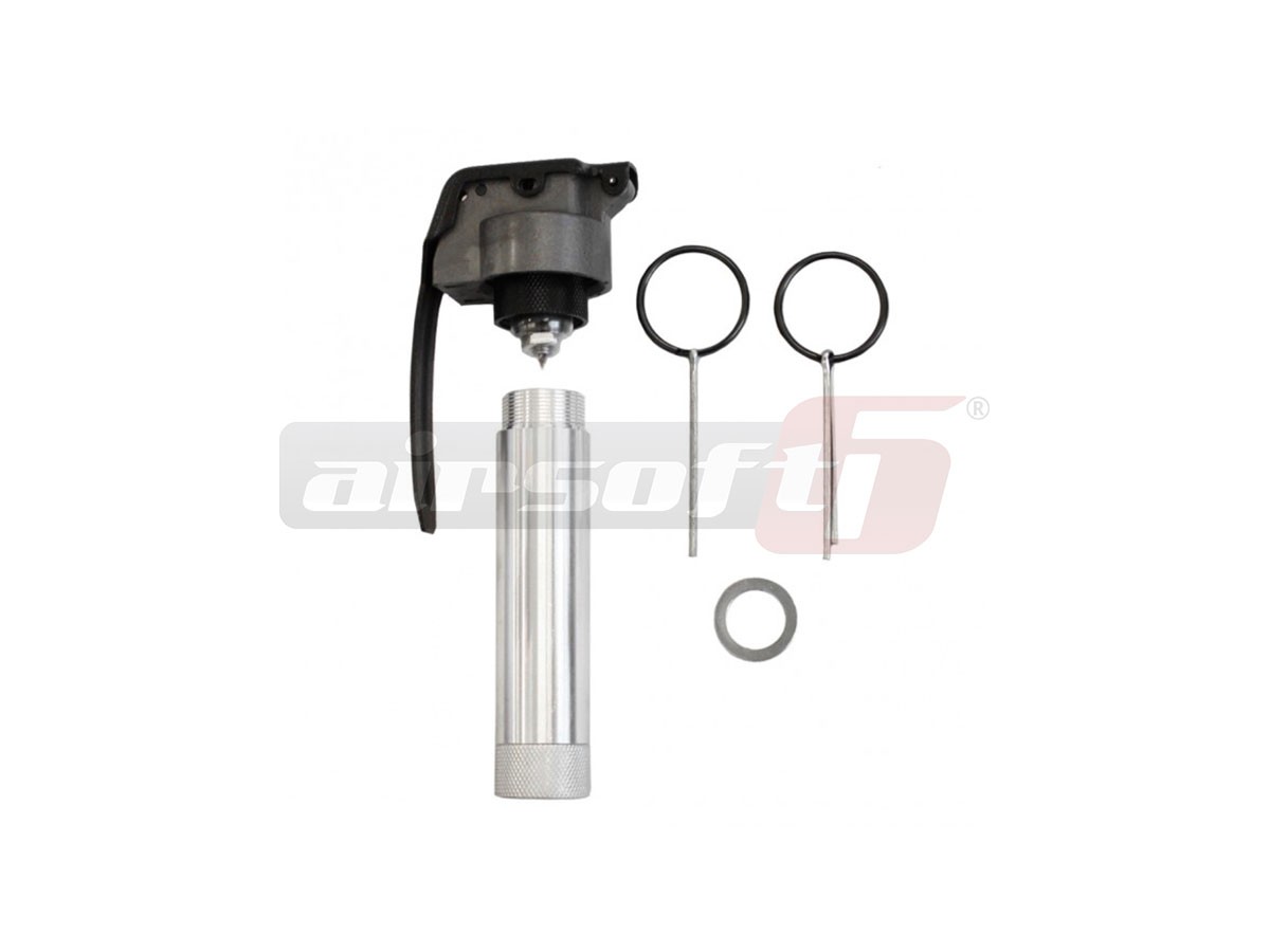 Corpul principal este fabricat din plastic ABS iar celelalte elemente sunt din aluminiu. Sursa pricipala de energie pentru generarea sunetului este CO2-ul. Declansatorul utilizeaza capsule de 12g cu CO2. Pentru fiecare utilizare este consumata intreaga fiola. Acest declansator functioneaza cu rezerve din plastic de unica folosinta. Pentru utilizarea corespunzatoare a grenadei se recomanda sa cititi cu atentie MANUALUL CU INTRUCTIUNI DE UTILIZARE in limba engleza.