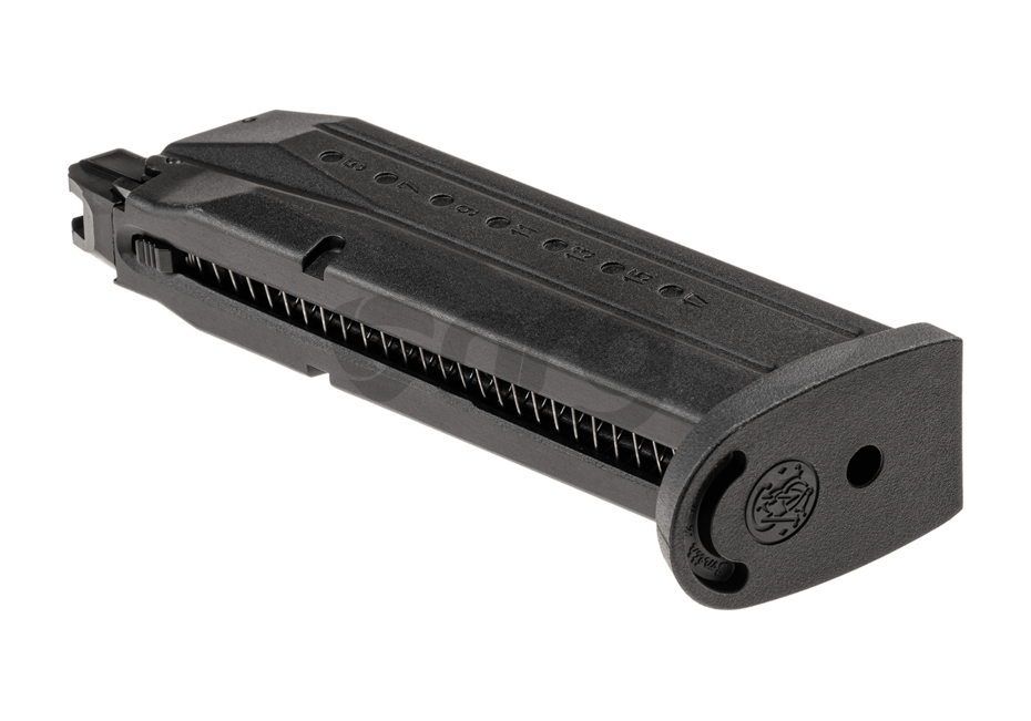 Incarcator produs de catre Smith&Wesson pentru platforma M&P9 PC. Acest incarcator poate fi folosit cu gaz Green Gas sau alte variante de gaz cu propietati asemanatoare.Este construit din metal iar gura de alimentare cu bile este din plastic.