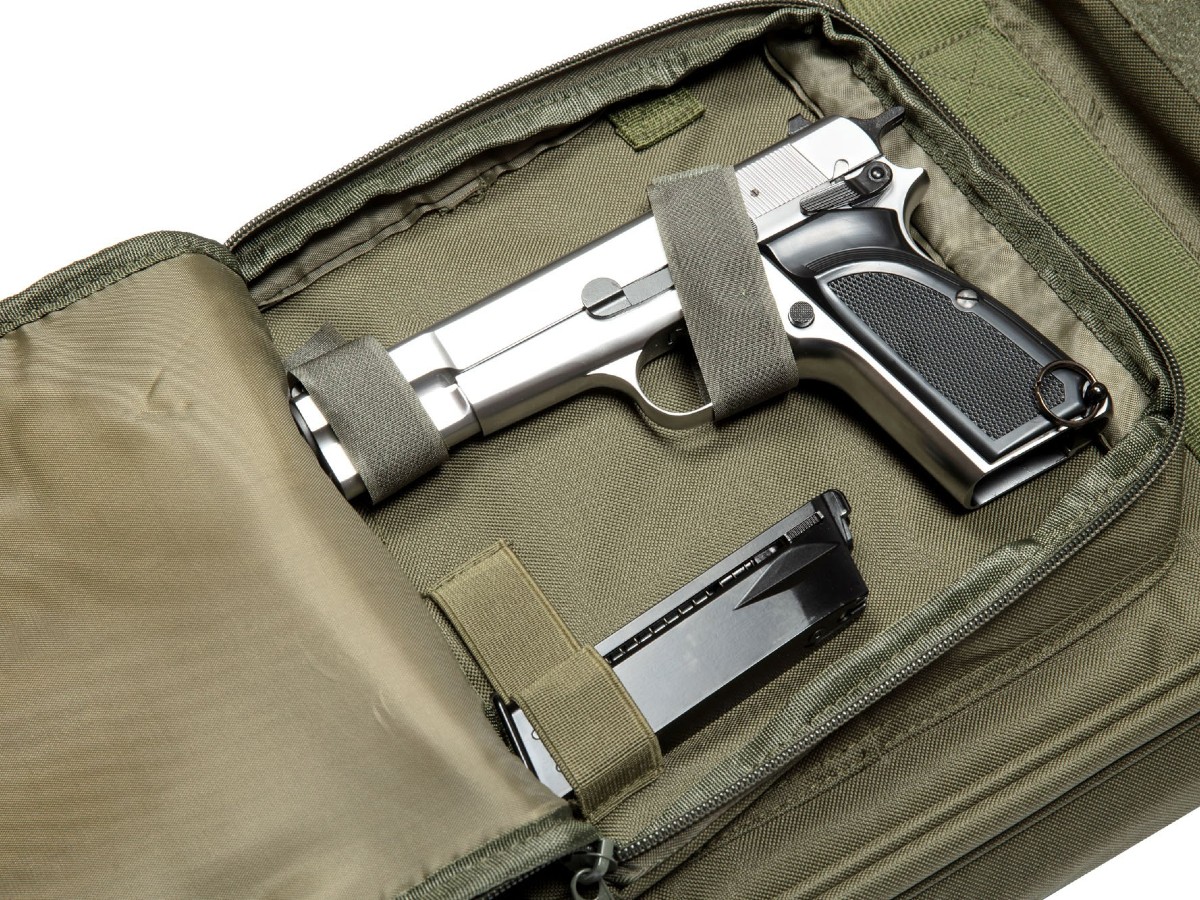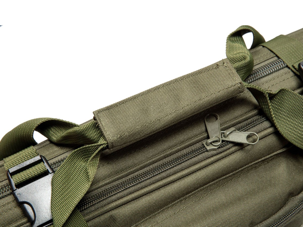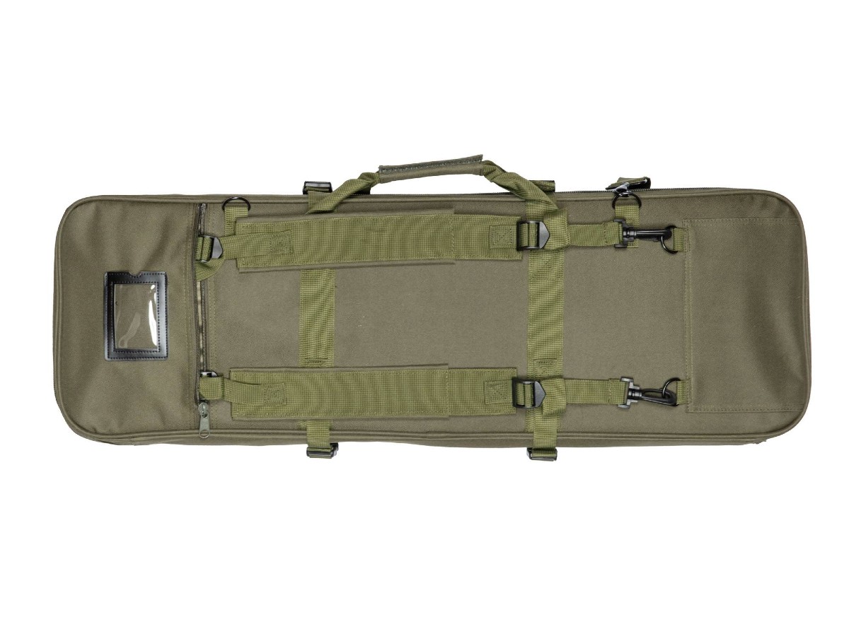 Geanta de transport este prevazuta cu un compartiment principal mare cu fermoar bidirectional prevazut cu curele de fixare a replicii, un buzunar mare, suplimentar care permite depozitarea accesoriilor sau a unei replici cu o lungime maxima de 550mm, 3 buzunare suplimentare, mai mici pentru accesorii inclusiv pentru transportarea unui pistol, un buzunar mic, plat in partea din spate a gentii util pentru transportul obiectelor de mici dimensiuni.