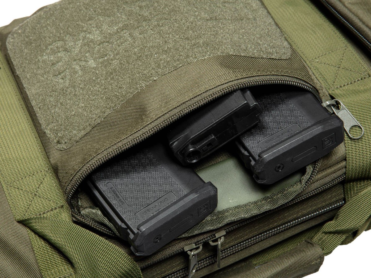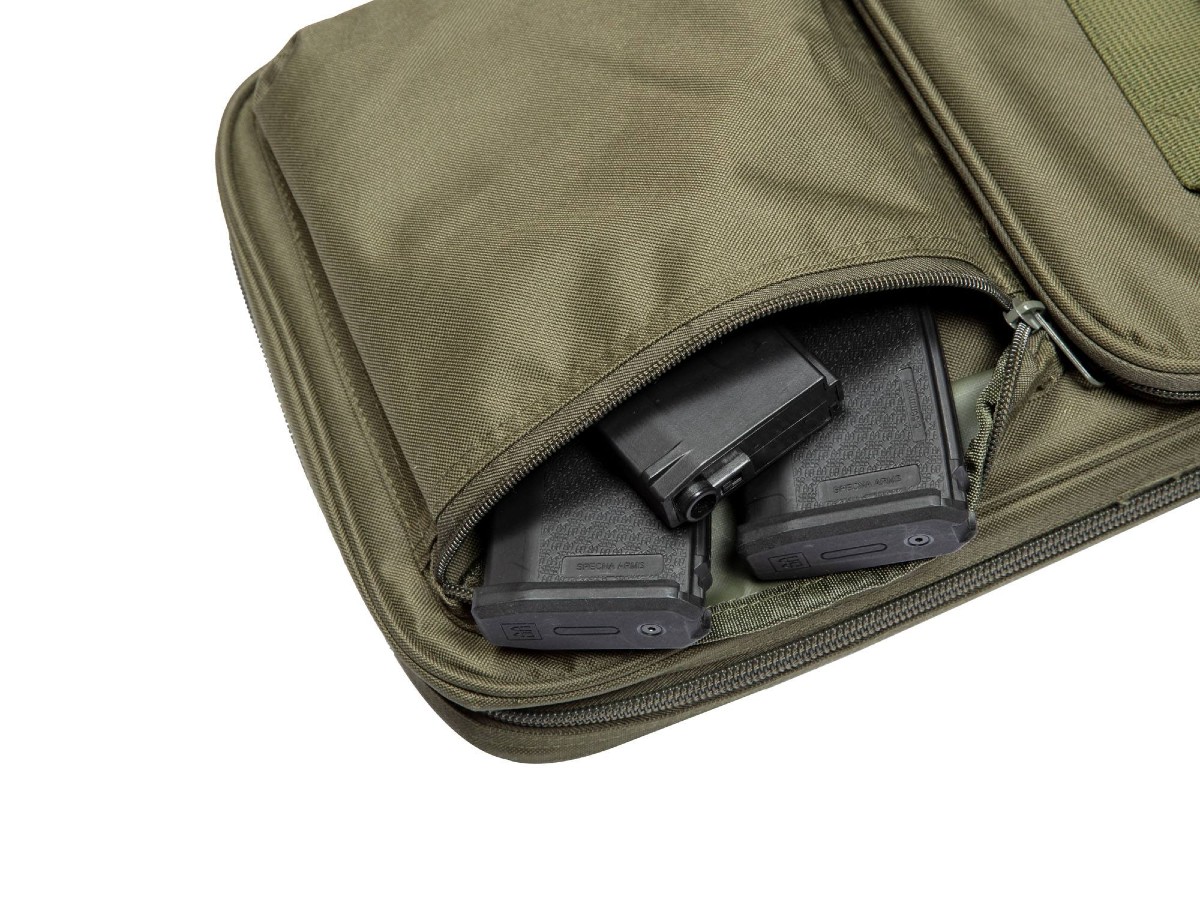 Geanta destinata transportului replicilor de airsoft. Aceasta geanta oferita de Specna Arms este fabricata din nylon. Geanta poate transporta 2 replici: o replica cu lungimea maxima de 550mm si o carabina cu o lungime maxima de 810mm. Desfacerea buzunarului suplimentar mareste lungimea gentii pana la 1150mm. Datorita numeroaselor manere si a umplerii lor cu spuma moale, geanta Specna Arms permite transportul sigur a unei replici airsoft.