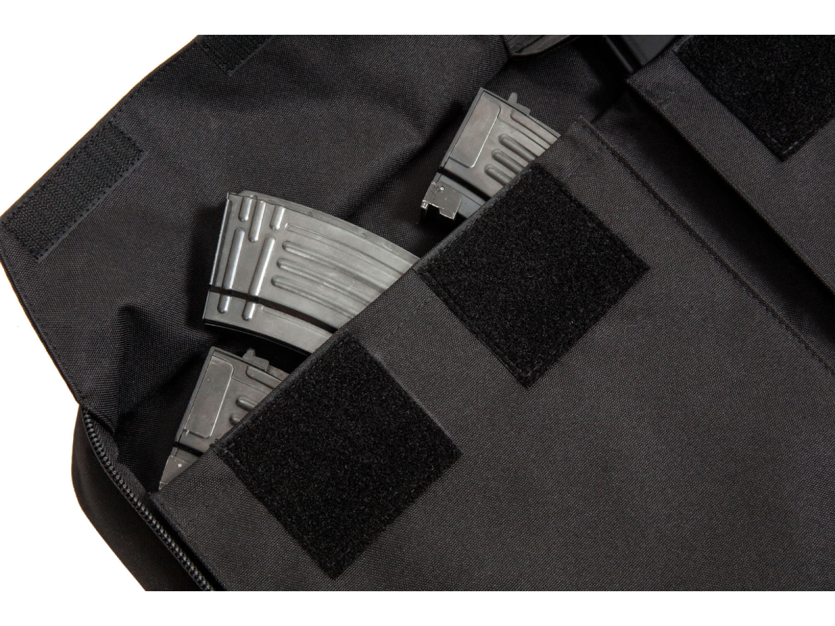 Geanta de transport este prevazuta cu un compartiment principal mare cu fermoar bidirectional prevazut cu curele de fixare a replicii, un buzunar mare si 3 buzunare mari interne, asigurate cu arici.