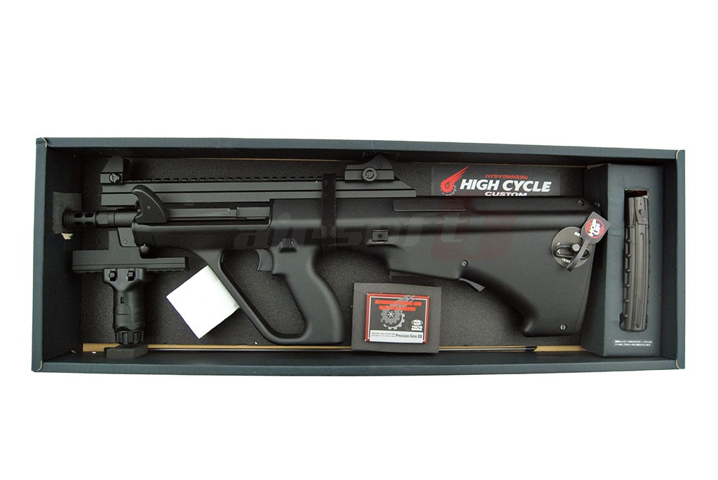 Seria High Cycle fabricata de Tokyo Marui reprezinta o categorie de jucarii de airsoft proiectate cu scopul de a oferi utilziatorilor o cadenta de tir foarte mare, de aici si denumirea "High Cycle" in traducere ciclu rapid. Asadar, utilizand un acumulator normal, fara alte investitii, aceasta jucarie este capabila de cadente uluitoare. Jucaria prezentata este un model asemanator platformei Austriece Steyr AUG.