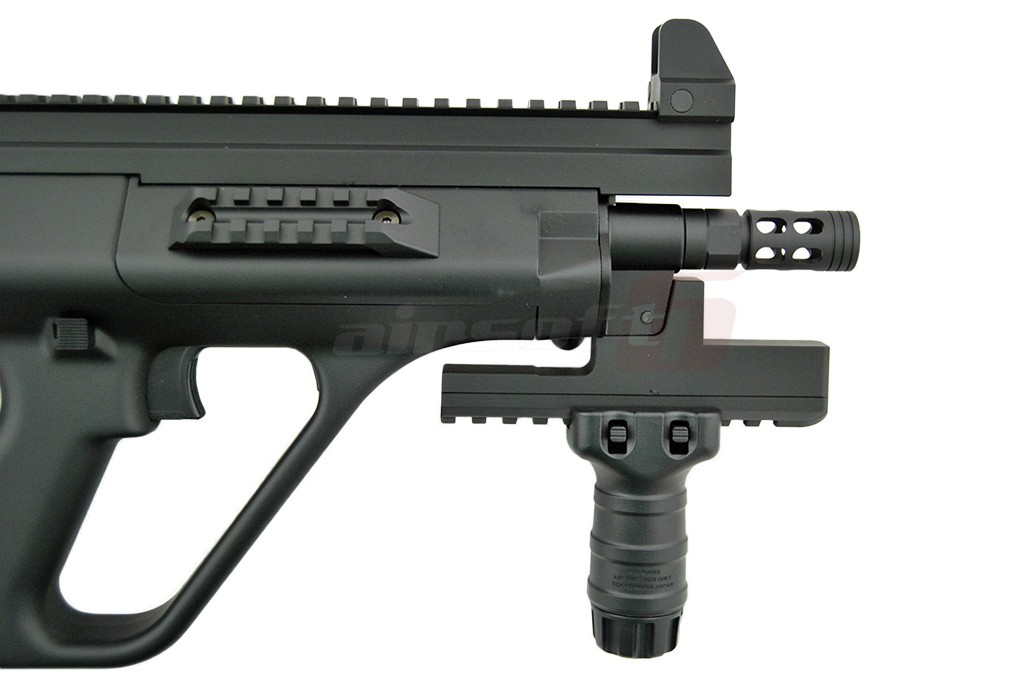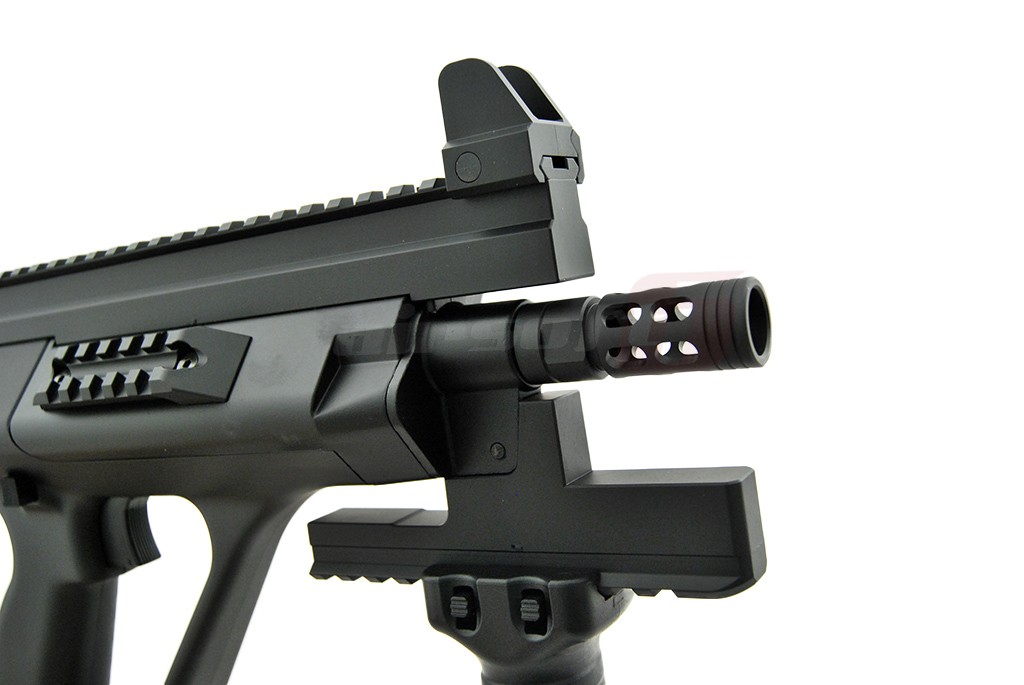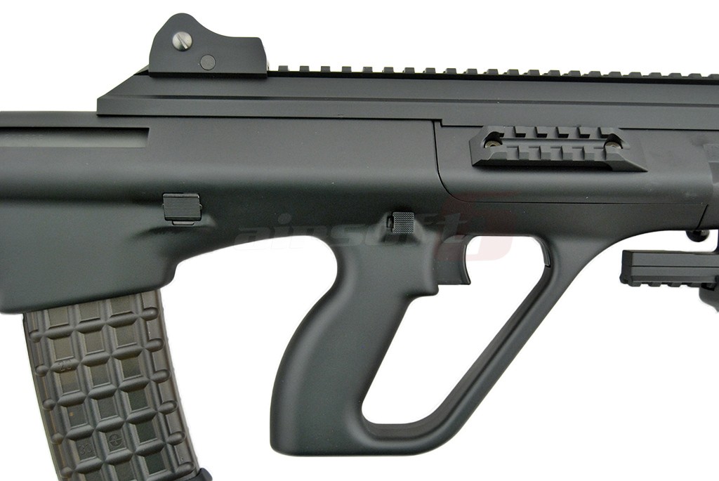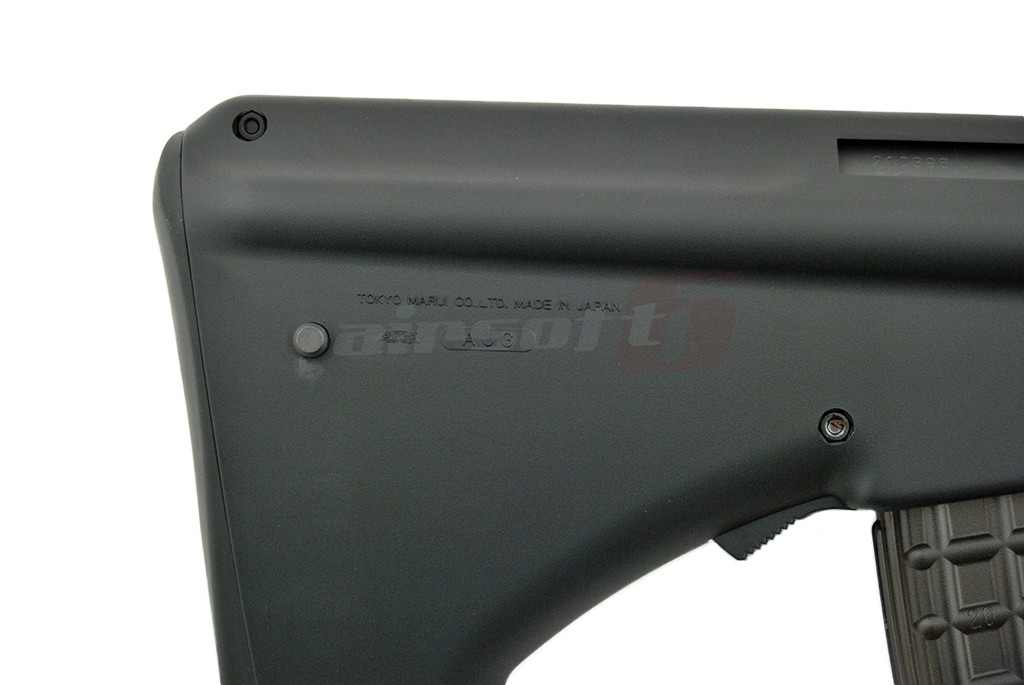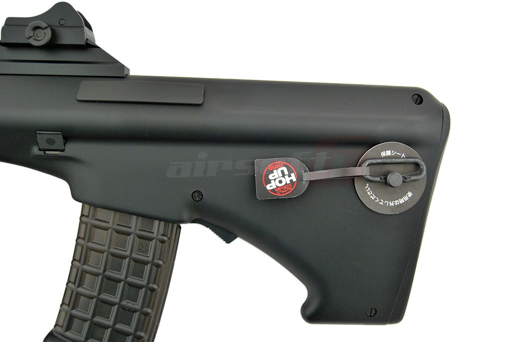 AUG High Cycle asemenea majoritatii jucariilor fabricate de Tokyo Marui este realizata in mare parte din plastic ABS. In mod evident este vorba de un plastic ABS de buna calitate foarte rezistent. In partea frontala exista o sina superioara standard ce va permite montarea unui dispozitiv optic. Venind vorba de sisteme de ochire, replica de airsoft este prevazuta cu un sistem de ochire clasic ce se poate demonta usor. In partea de jos exista un suport prevazut cu sina pe care se poate monta initial manerul inclus in pachet sau de ce nu, in alt tip de maner sau alte accesorii. Acest suport poate fi indepartat. In partea stanga exista levierul de armare, care odata actionat va descoperi in partea din spate portul ejector. Selectorul de tir este situat deasuprea manerului si are 3 pozitii, SAFE, SEMI si AUTO. De remarcat este tragaciul replicii de airsoft in 2 stadii. Daca replica de airsoft este setata pe AUTO, tragaciul permite actionarea SEMI a replicii de airsoft. Se poate remarca inca de la prima vedere ca incarcatorul replicii de airsoft este pozitionat in partea din spate a manerului. Acest aspect ofera posibilitatea utilizarii unei tevi interne cu o lungime mai mare decat in cazul in care incarcatorul ar fi fost situat in partea din fata a manerului. Butonul pentru eliberarea incarcatorului este foarte aproape de incarcator si poate fi actionat atat din stanga cat si din dreapta replicii de airsoft. Se poate spune ca aceasta jucarie este in mare masura ambidextra. Aspect avantajos pentru stangaci.