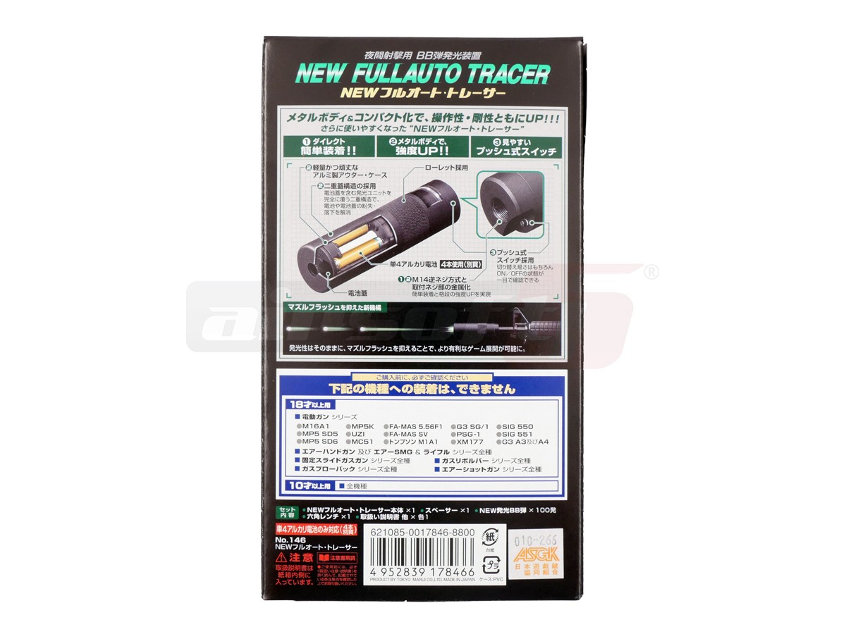 Acest dispozitiv fabricat de Tokyo Marui si functioneaza cu 4 baterii sau acumulatori AAA. Pentru montarea lor este necesar incepartarea partii externe prin desfiletare. Odata indepartata partea interioara va exista un capac in fata sub care exista soclurile speciale pentru sursa de alimentare. Odata montate corect bateriile sau acumulatorii, dispozitivul poate fi pornit cu ajutorul butonului din spate, prevazut cu 2 pozitii. Banda alba indica activarea dispozitivului. Va recomandam sa utilizati doar bile de calitate superioara, fosforescente.