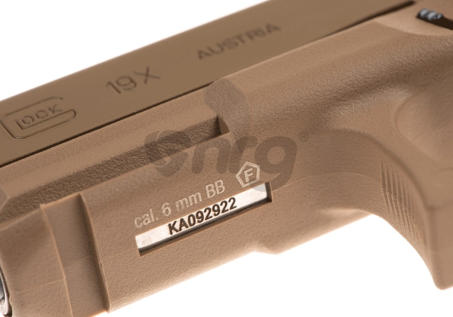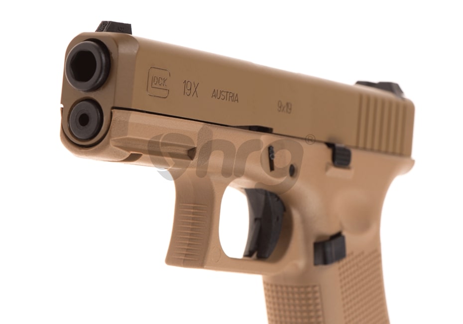 Aceasta replica este fabricata de Umarex, sub licenta Glock si copiaza G19X Tan Partea inferioara este fabricata din nylon si prezinta in partea manerului o textura menita sa ofera o aderenta imbunatatita. Mansonul sau partea superioara este fabricata din aliaj de aluminiu. Bravurile de pe manson, in afara de aspectul placut pe care il ofera au si scop practic, oferind o prindere ferma atunci cand este armat. Teava externa este deasemenea din metal si este prevazuta in partea frontala cu filet pentru a putea fixa un amortizor extern.