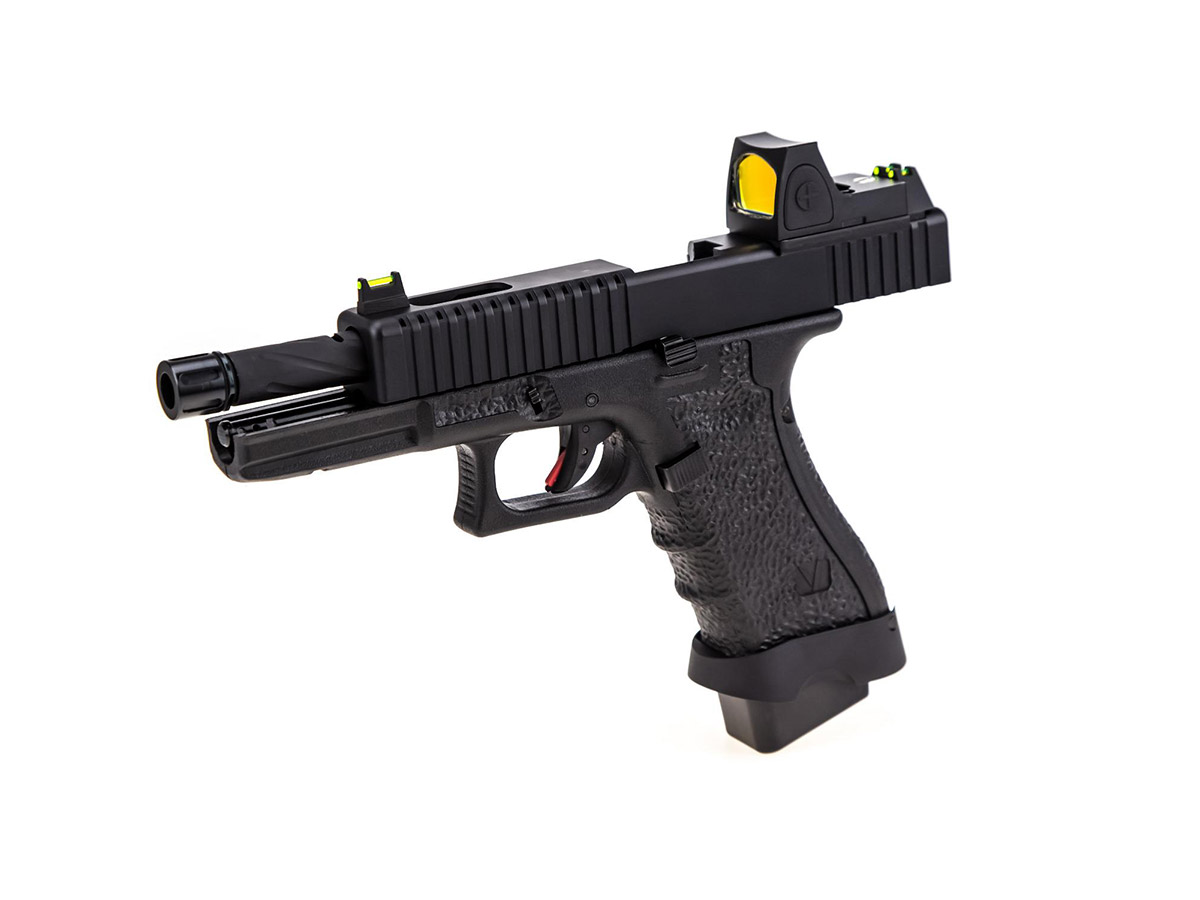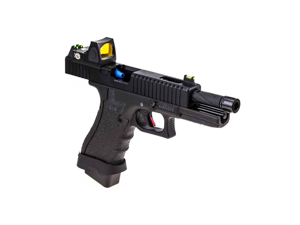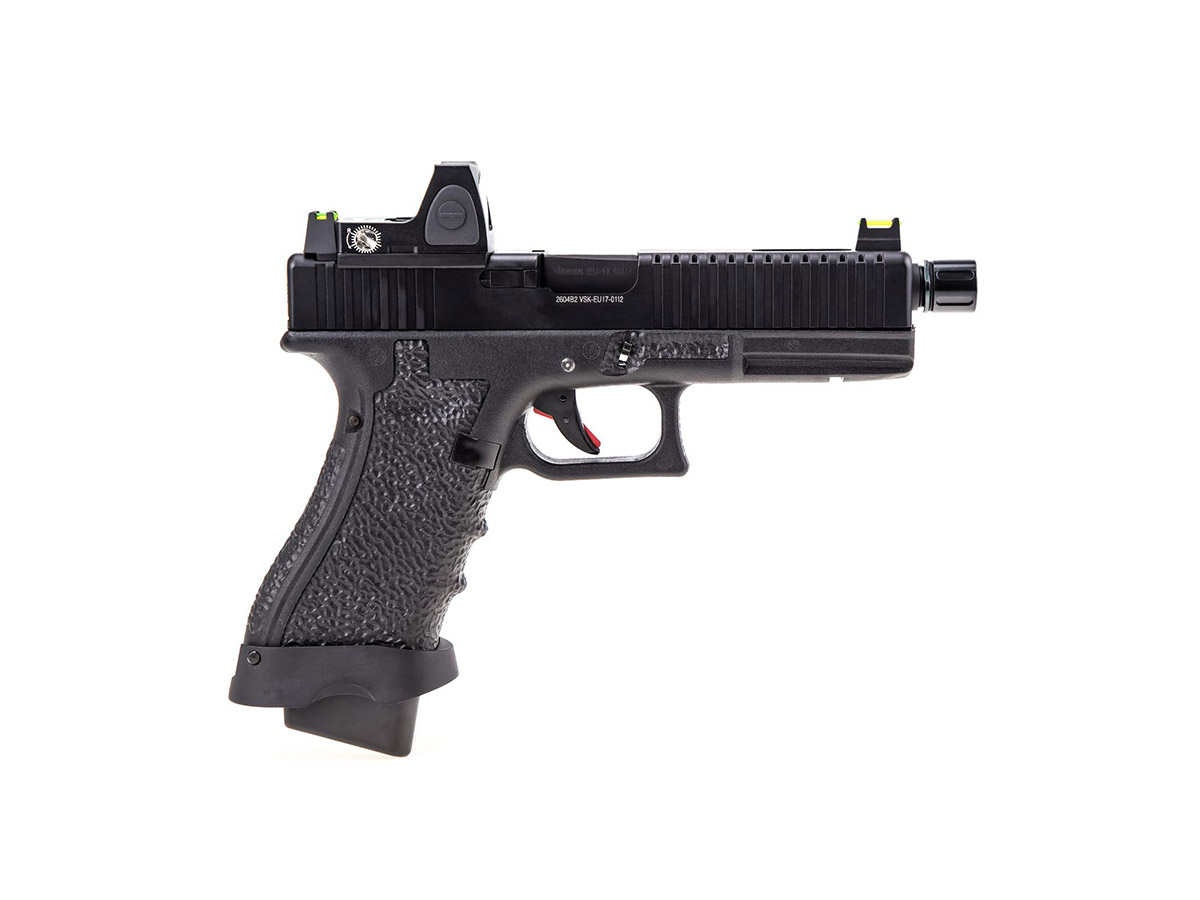 Modelul EU17 BDS copiaza o platforma cunoscuta, astfel acomodarea va fi rapida si usoara. Pistolul este realizat din materiale premium si asamblat cu mare atentie. Mansonul este fabricat din aluminiu iar manerul este realiat din fibra de nylon. Seratiile slide-ului iti vor permite sa armezi mai usor iar stippling-ul manerului iti va permite o prindere ferma in timpul exploatarii. Cu ajutorul red-dot-ului inclus in pachet vei reusi sa ochesti mult mai usor. In partea din fata exista o sina non-standard pe care vom putea monta anumite lasere sau lanterne tactice. Teava externa prezinta un design frumos iar in partea din fata exista un filet acoperit, de 14mm sens invers. In pachet exista 2 sisteme de ochire, unul cu elemente fluorescente, inalt si unul standard. Preselele manerului din partea din spate se pot schimba, in pachet existand inca 2 dimensiuni.