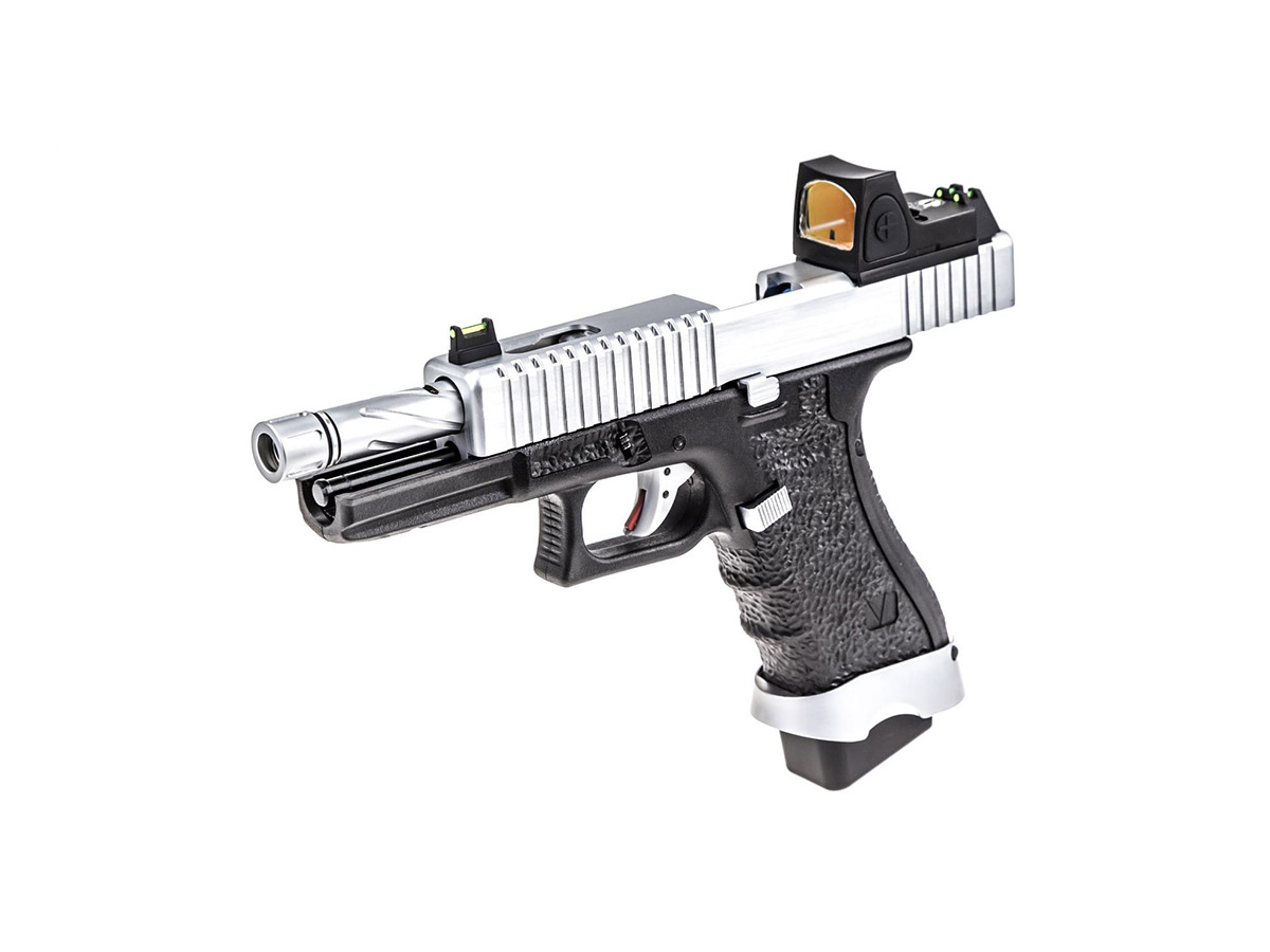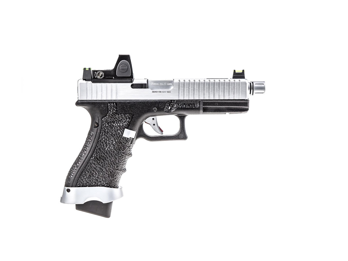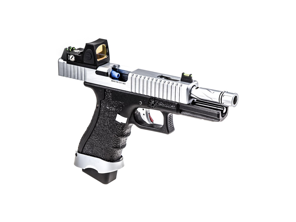 Modelul EU17 BDS Silver copiaza o platforma cunoscuta, astfel acomodarea va fi rapida si usoara. Pistolul este realizat din materiale premium si asamblat cu mare atentie. Mansonul este fabricat din aluminiu iar manerul este realiat din fibra de nylon. Seratiile slide-ului iti vor permite sa armezi mai usor iar stippling-ul manerului iti va permite o prindere ferma in timpul exploatarii. Cu ajutorul red-dot-ului inclus in pachet vei reusi sa ochesti mult mai usor. In partea din fata exista o sina non-standard pe care vom putea monta anumite lasere sau lanterne tactice. Teava externa prezinta un design frumos iar in partea din fata exista un filet acoperit, de 14mm sens invers. In pachet exista 2 sisteme de ochire, unul cu elemente fluorescente, inalt si unul standard. Preselele manerului din partea din spate se pot schimba, in pachet existand inca 2 dimensiuni.