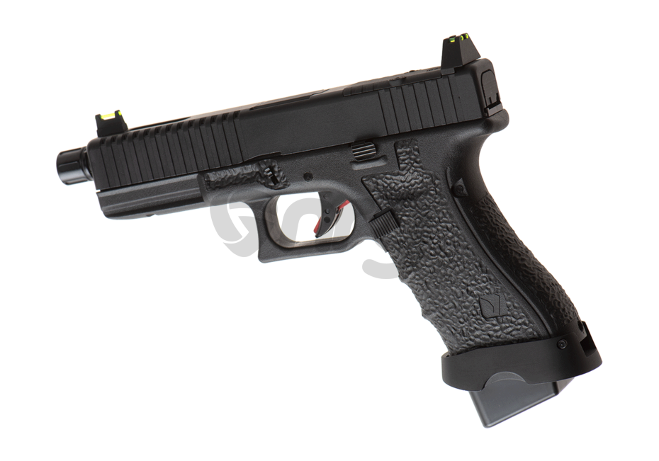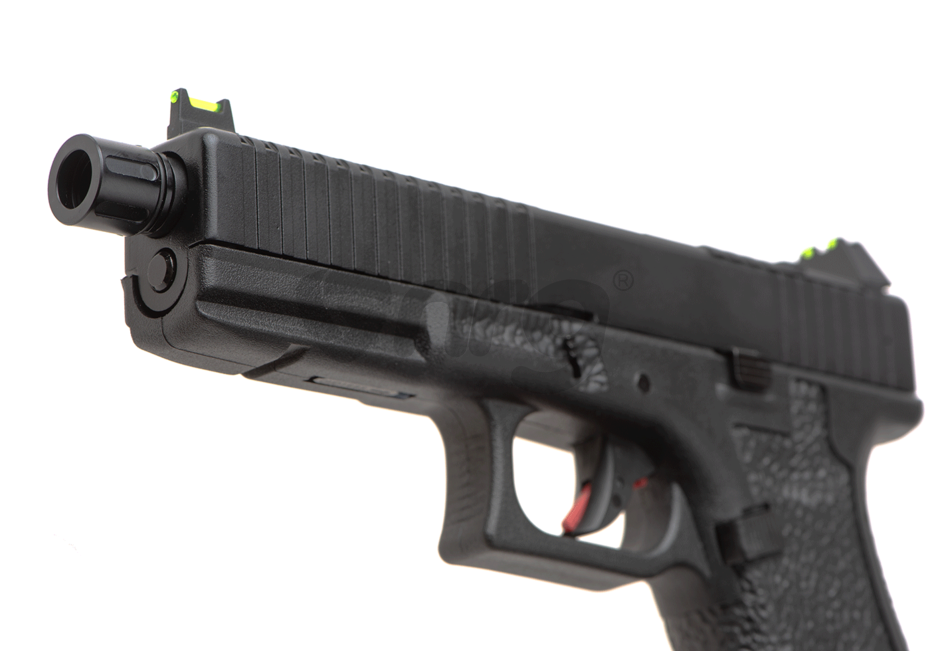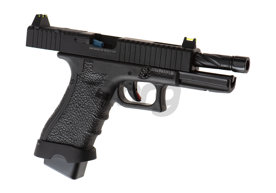 Modelul EU17 vented copiaza o platforma cunoscuta, astfel acomodarea va fi rapida si usoara. Pistolul este realizat din materiale premium si asamblat cu mare atentie. Mansonul este fabricat din aluminiu iar manerul este realiat din fibra de nylon. Seratiile slide-ului iti vor permite sa armezi mai usor iar stippling-ul manerului iti va permite o prindere ferma in timpul exploatarii. In partea din fata exista o sina non-standard pe care vom putea monta anumite lasere sau lanterne tactice. Teava externa prezinta un design frumos iar in partea din fata exista un filet acoperit, de 14mm sens invers. In pachet exista 2 sisteme de ochire, unul cu elemente fluorescente, inalt si unul standard. Preselele manerului din partea din spate se pot schimba, in pachet existand inca 2 dimensiuni.