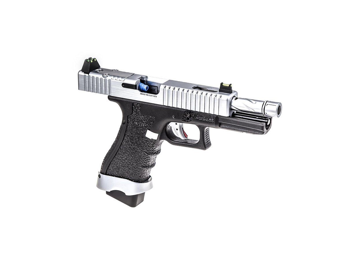 Modelul EU17 copiaza o platforma cunoscuta, astfel acomodarea va fi rapida si usoara. Pistolul este realizat din materiale premium si asamblat cu mare atentie. Mansonul este fabricat din aluminiu iar manerul este realiat din fibra de nylon. Seratiile slide-ului iti vor permite sa armezi mai usor iar stippling-ul manerului iti va permite o prindere ferma in timpul exploatarii. In partea din fata exista o sina non-standard pe care vom putea monta anumite lasere sau lanterne tactice. Teava externa prezinta un design frumos iar in partea din fata exista un filet acoperit, de 14mm sens invers. In pachet exista 2 sisteme de ochire, unul cu elemente fluorescente, inalt si unul standard. Preselele manerului din partea din spate se pot schimba, in pachet existand inca 2 dimensiuni.