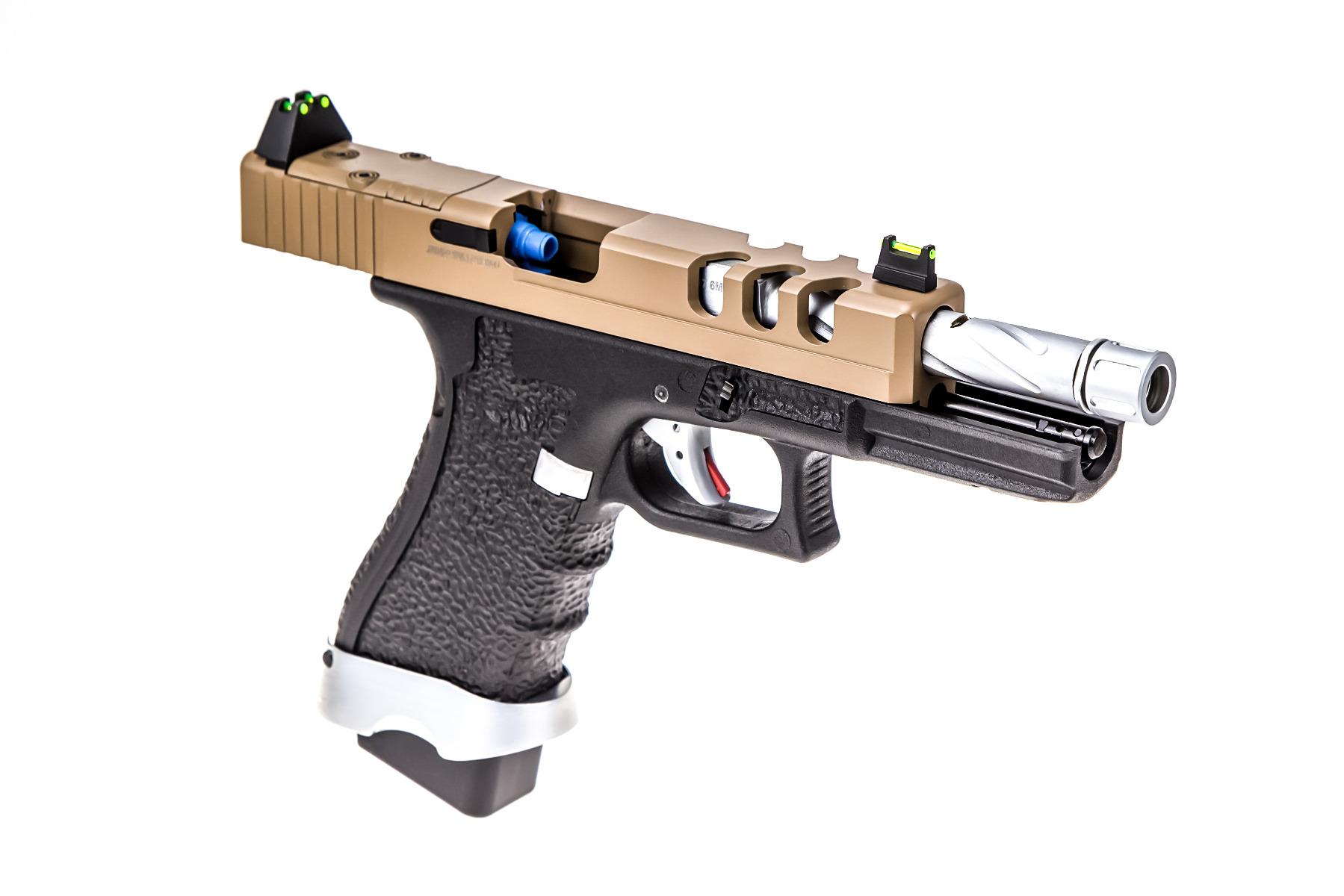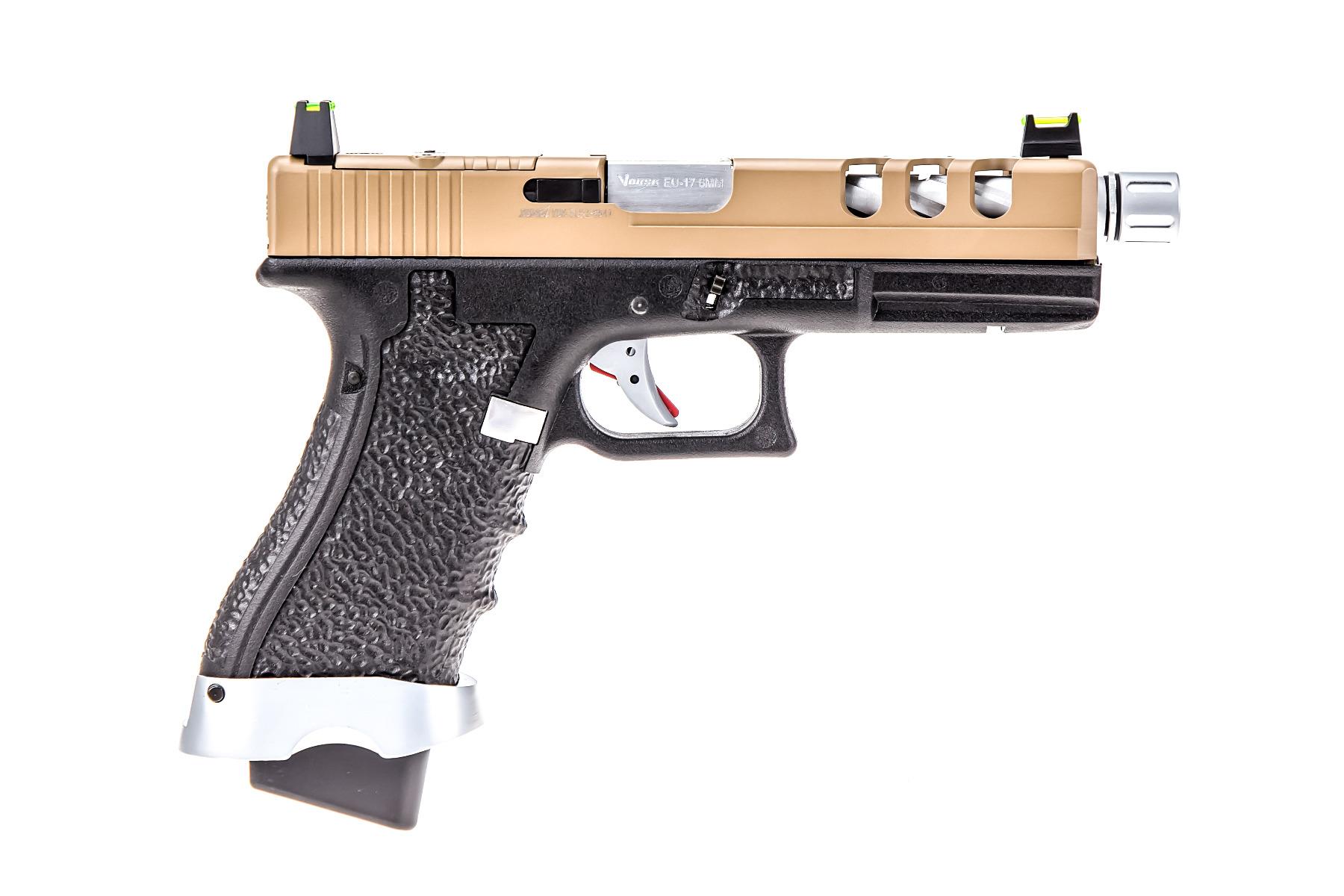Modelul EU17 copiaza o platforma cunoscuta, astfel acomodarea va fi rapida si usoara. Pistolul este realizat din materiale premium si asamblat cu mare atentie. Mansonul este fabricat din aluminiu iar manerul este realiat din fibra de nylon. Seratiile slide-ului iti vor permite sa armezi mai usor iar stippling-ul manerului iti va permite o prindere ferma in timpul exploatarii. In partea din fata exista o sina non-standard pe care vom putea monta anumite lasere sau lanterne tactice. Teava externa prezinta un design frumos iar in partea din fata exista un filet acoperit, de 14mm sens invers. In pachet exista 2 sisteme de ochire, unul cu elemente fluorescente, inalt si unul standard. Preselele manerului din partea din spate se pot schimba, in pachet existand inca 2 dimensiuni.