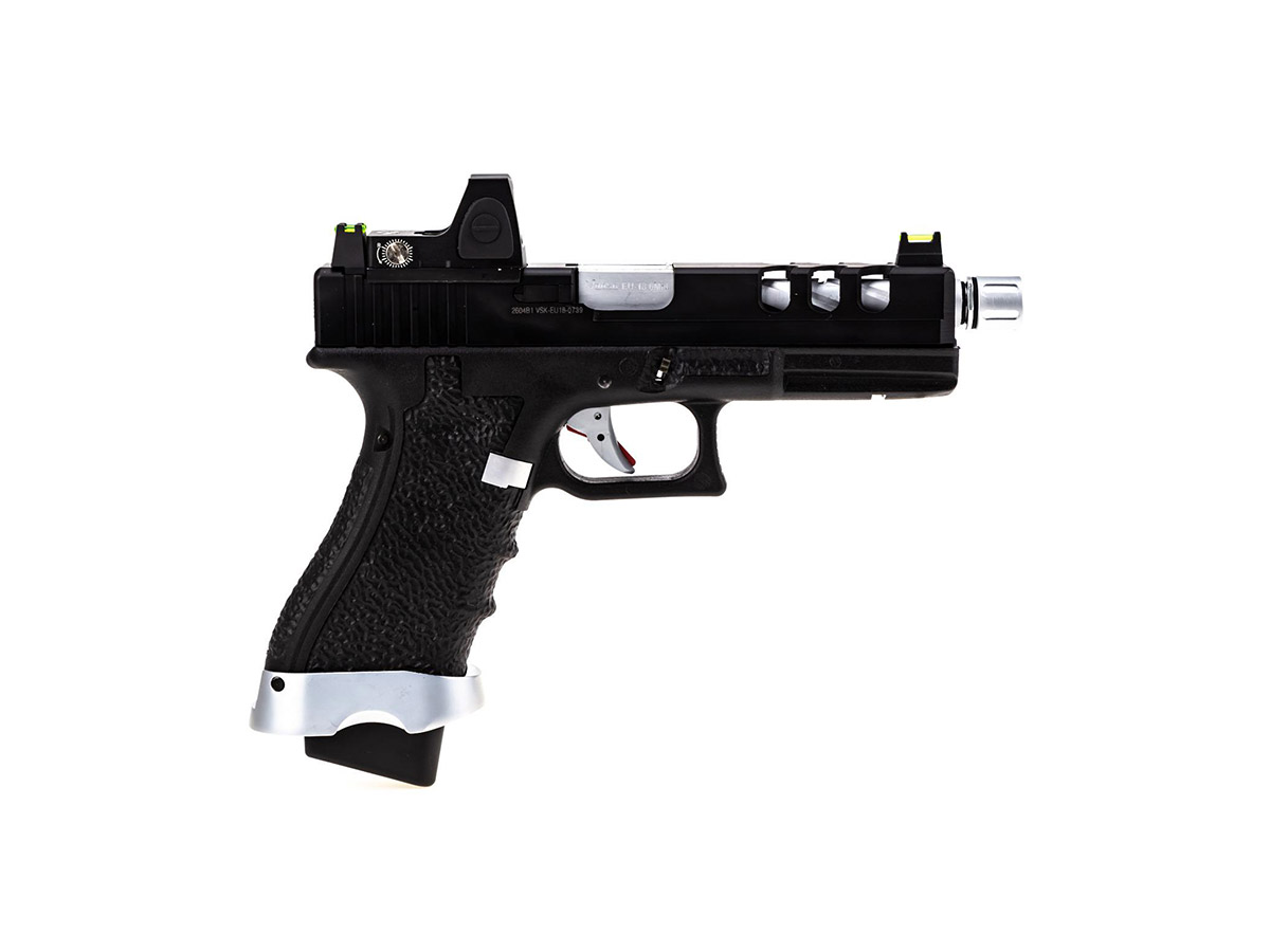 Modelul EU18 BDS vented copiaza o platforma cunoscuta, astfel acomodarea va fi rapida si usoara. Pistolul este realizat din materiale premium si asamblat cu mare atentie. Mansonul este fabricat din aluminiu iar manerul este realiat din fibra de nylon. Seratiile slide-ului iti vor permite sa armezi mai usor iar stippling-ul manerului iti va permite o prindere ferma in timpul exploatarii. Cu ajutrul red-dot-ului inclus in pachet vei reusi sa ochesti mult mai usor. In partea din fata exista o sina non-standard pe care vom putea monta anumite lasere sau lanterne tactice. Teava externa prezinta un design frumos iar in partea din fata exista un filet acoperit, de 14mm sens invers. Preselele manerului din partea din spate se pot schimba, in pachet existand inca 2 dimensiuni.