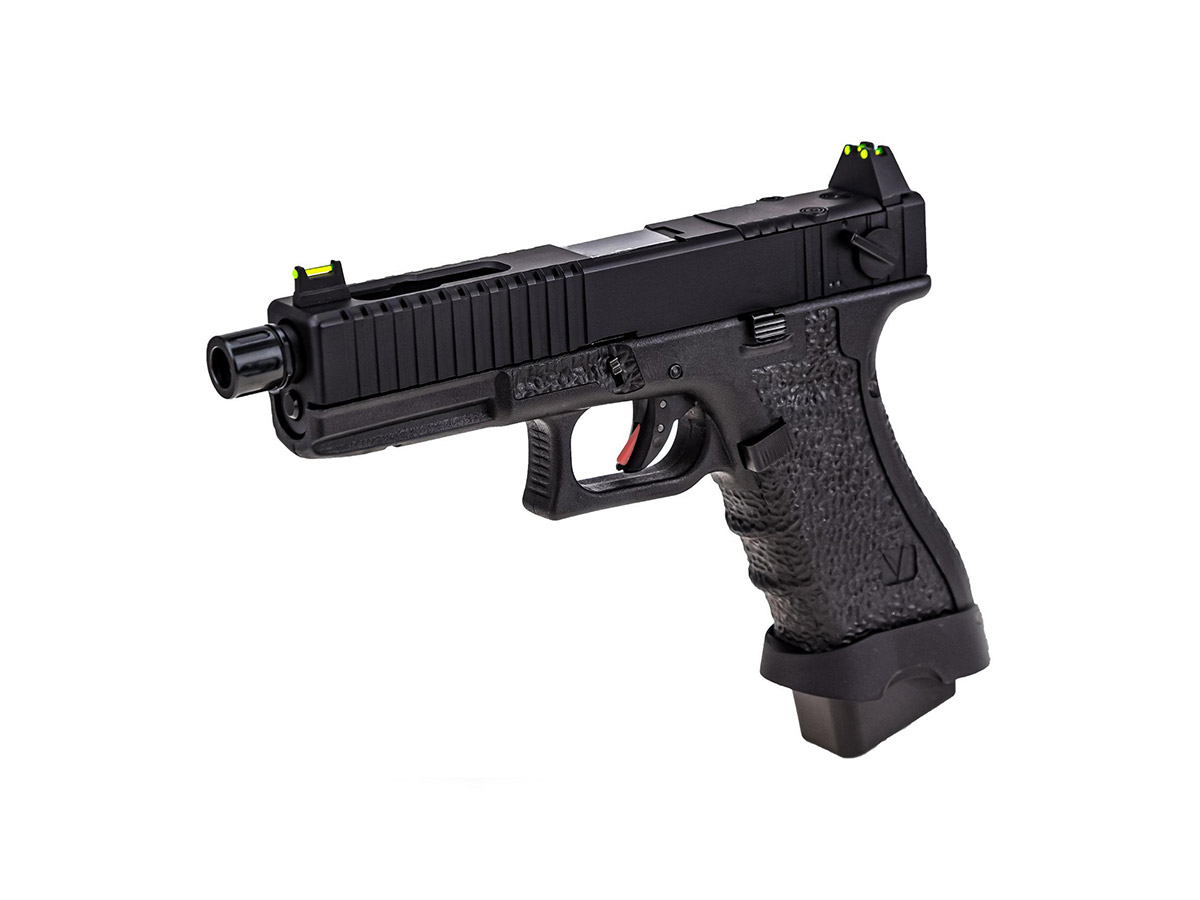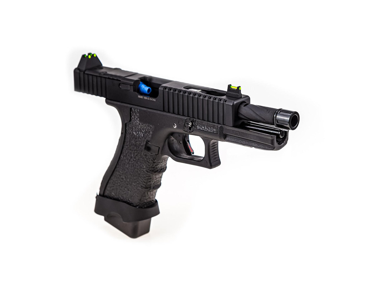 Modelul EU18 copiaza o platforma cunoscuta, astfel acomodarea va fi rapida si usoara. Pistolul este realizat din materiale premium si asamblat cu mare atentie. Mansonul este fabricat din aluminiu iar manerul este realiat din fibra de nylon. Seratiile slide-ului iti vor permite sa armezi mai usor iar stippling-ul manerului iti va permite o prindere ferma in timpul exploatarii. In partea din fata exista o sina non-standard pe care vom putea monta anumite lasere sau lanterne tactice. Teava externa prezinta un design frumos iar in partea din fata exista un filet acoperit, de 14mm sens invers. In pachet exista 2 sisteme de ochire, unul cu elemente fluorescente, inalt si unul standard. Preselele manerului din partea din spate se pot schimba, in pachet existand inca 2 dimensiuni.