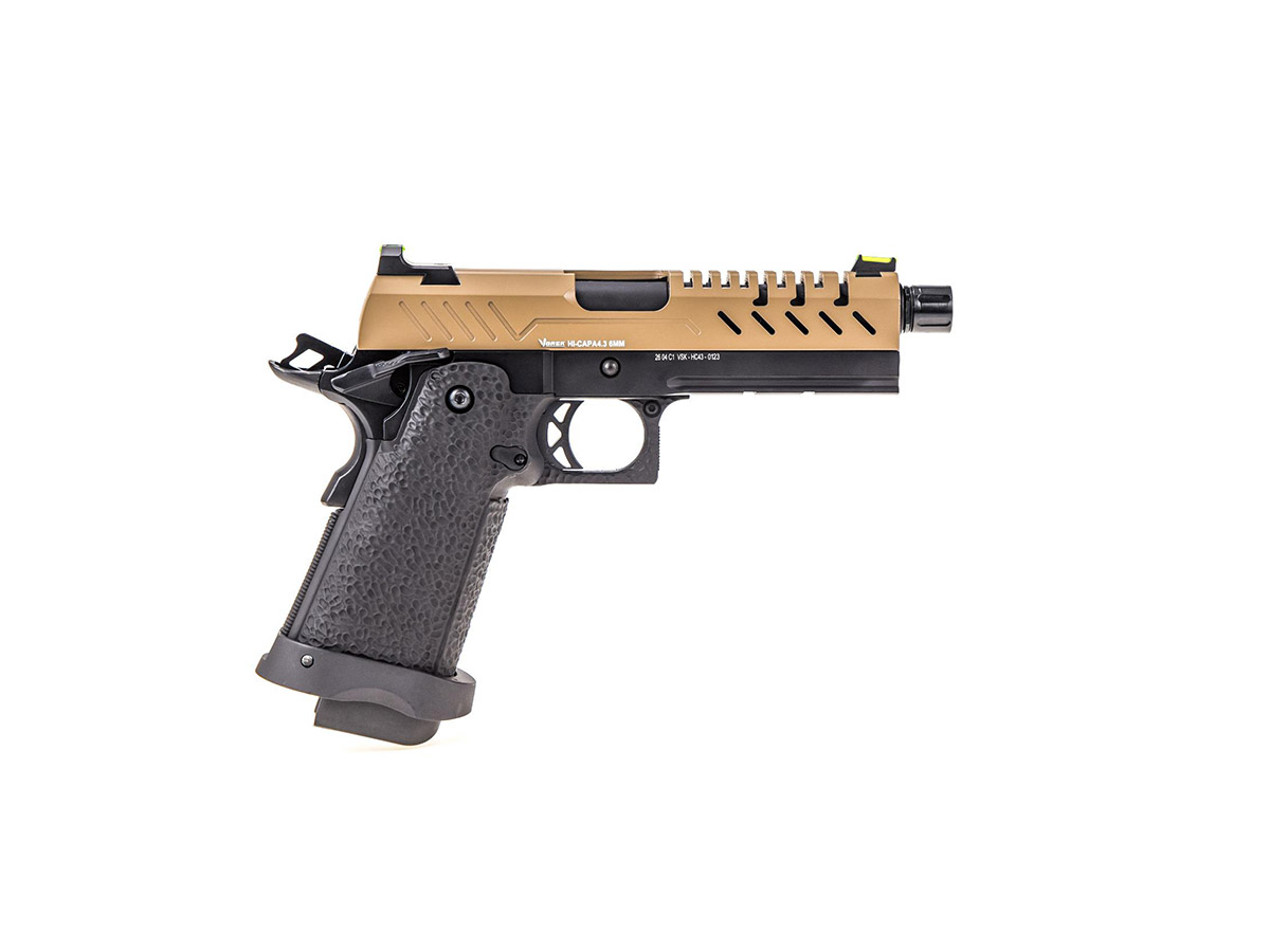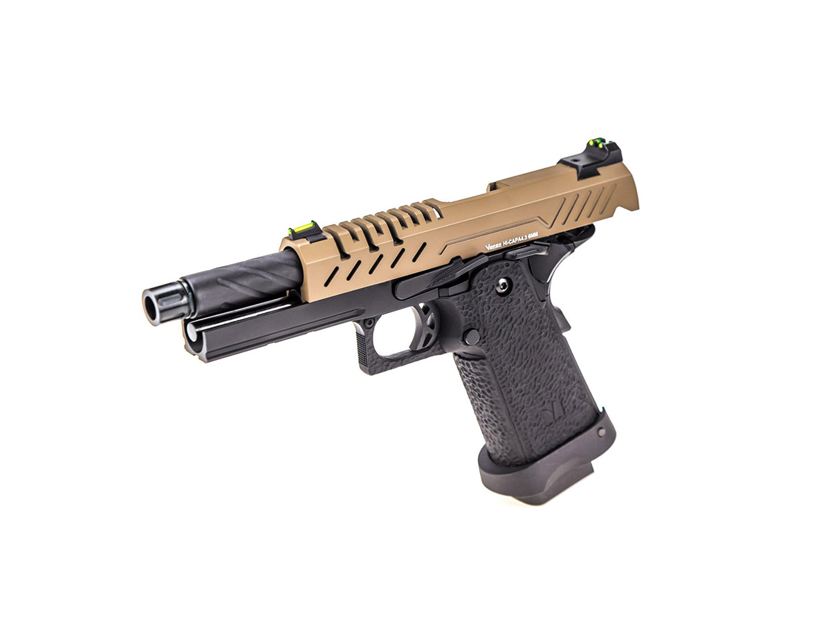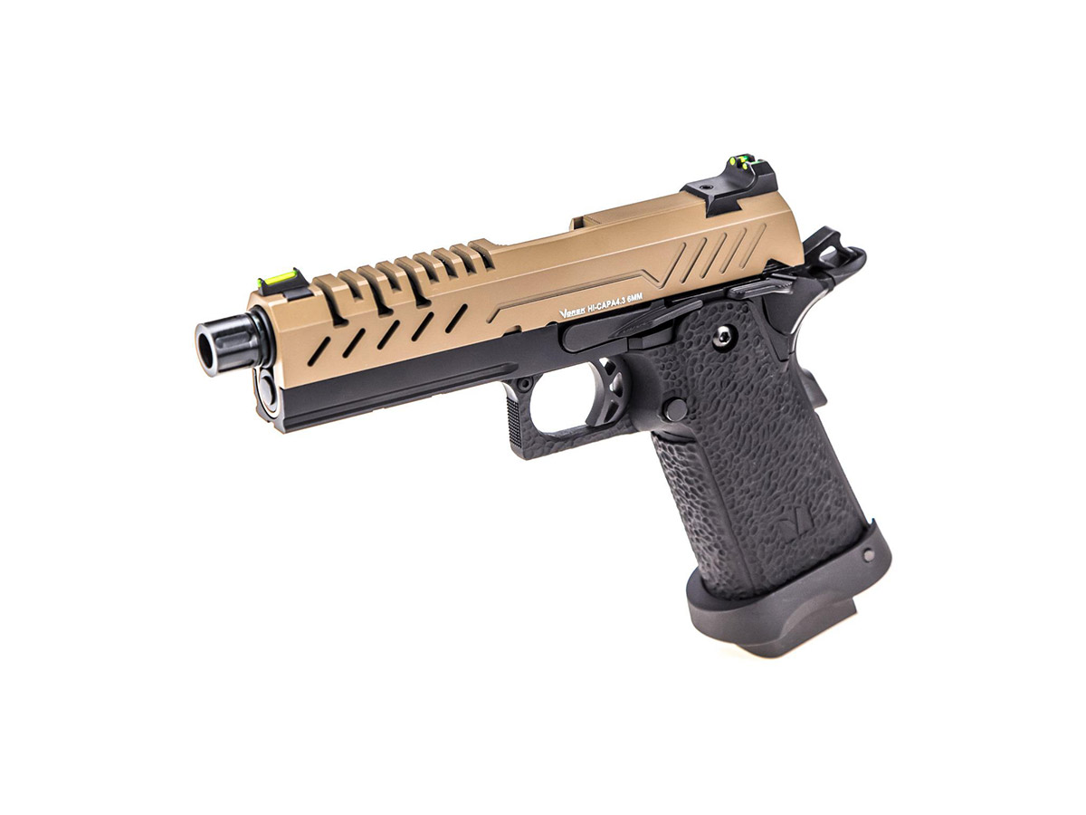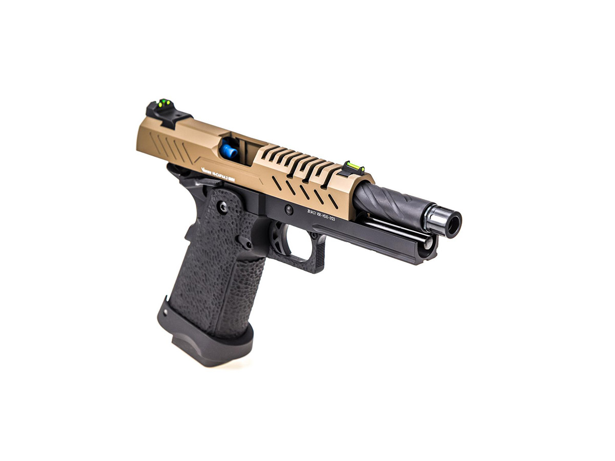 Modelul hi-capa 4.3 tan/negru copiaza o platforma comuna, astfel acomodarea va fi rapida si usoara. Pistolul este realizat din materiale premium si asamblat cu mare atentie. Mansonul este fabricat din aluminiu, deasemenea fi partea centrala iar manerul este realiat din fibra de nylon. Seratiile slide-ului iti vor permite sa armezi mai usor iar stippling-ul manerului iti va permite o prindere ferma in timpul exploatarii. In partea din fata exista o sina non-standard pe care vom putea monta anumite lasere sau lanterne tactice. Teava externa prezinta un design frumos iar in partea din fata exista un filet acoperit, de 14mm sens invers. Sistemul de ochire prezinta elemente fluorescente si orientarea lor este buna.