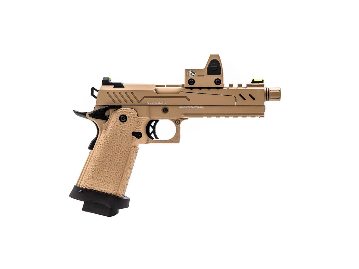 Modelul hi-capa 5.1 split slide tan copiaza o platforma comuna, astfel acomodarea va fi rapida si usoara. Pistolul este realizat din materiale premium si asamblat cu mare atentie. Mansonul este fabricat din aluminiu, deasemenea fi partea centrala  iar manerul este realiat din fibra de nylon. Seratiile slide-ului iti vor permite sa armezi mai usor iar stippling-ul manerului iti va permite o prindere ferma in timpul exploatarii. In partea din fata exista o sina non-standard pe care vom putea monta anumite lasere sau lanterne tactice. Teava externa prezinta un design frumos iar in partea din fata exista un filet acoperit, de 14mm sens invers. Sistemul de ochire mecanic este complementat cu un micro red-dot.