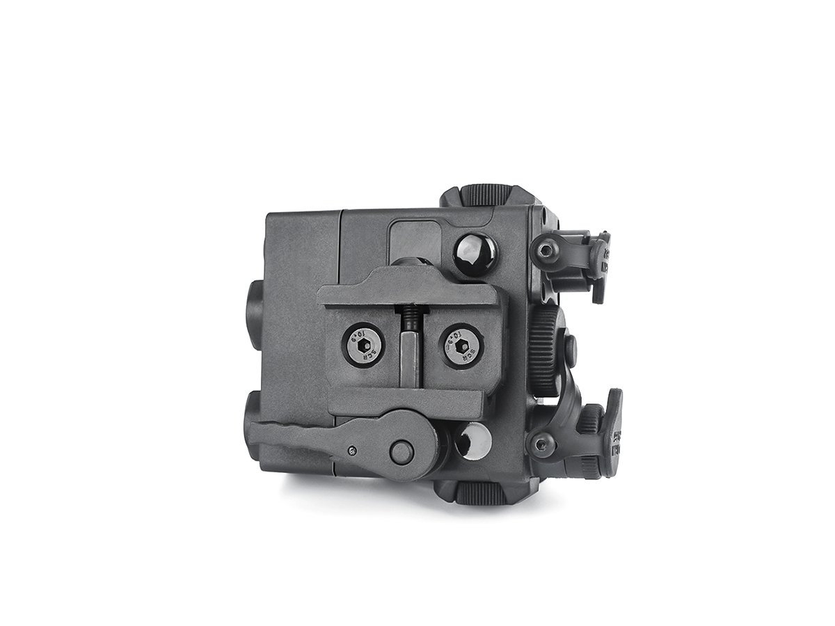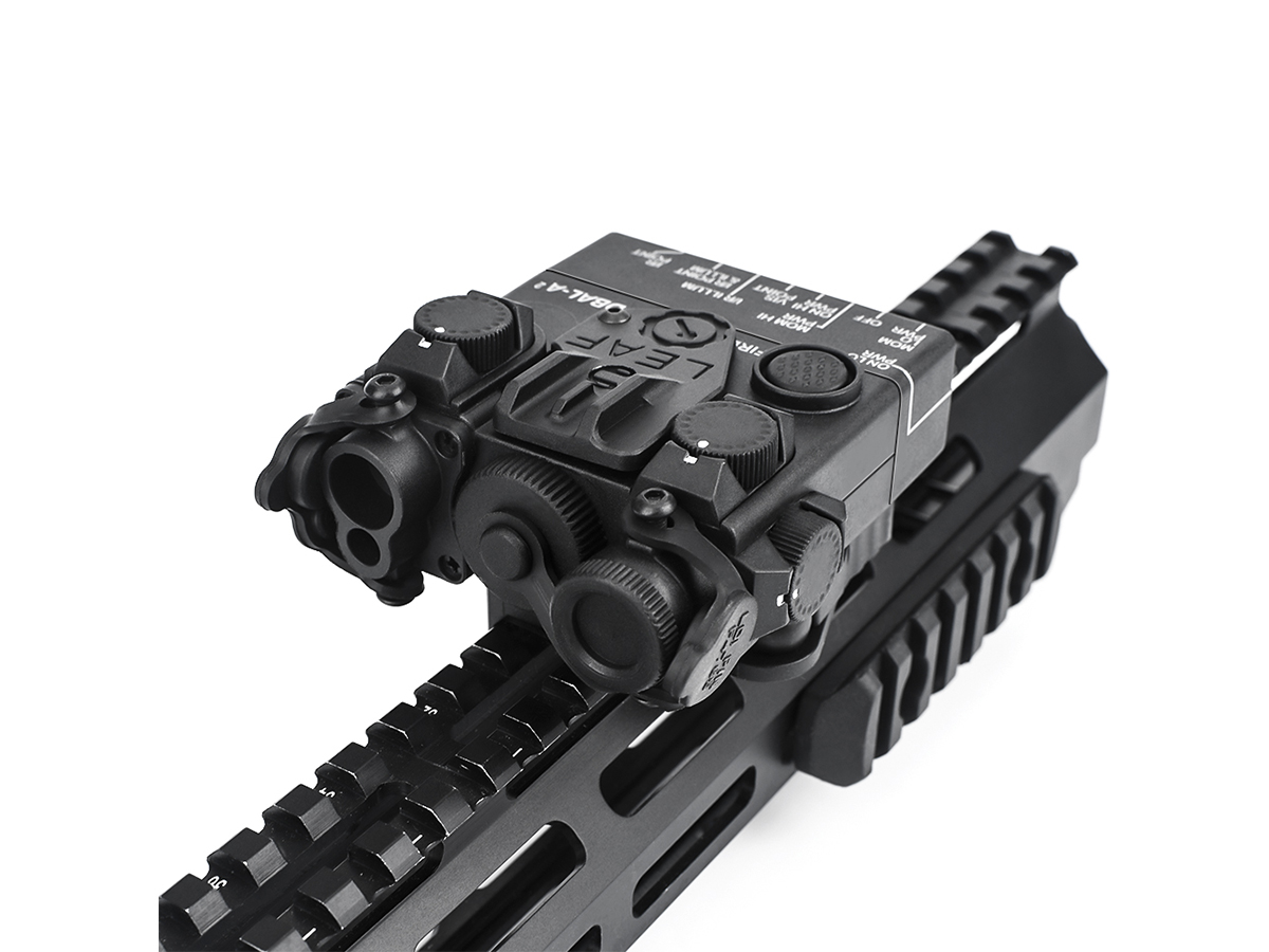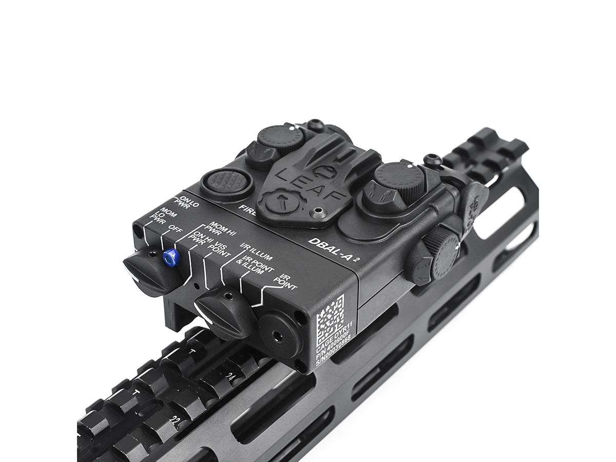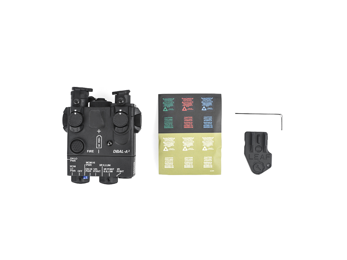 Acest produs oferit de WADSN are un rol strict ornamental. Este realizat din plastic ABS si imita modelul de punctator laser tactic DBAL A2. Producatorul a avut grija sa copieze toate briz-briz-urile dispozitivului real si marcajele aferente. In pachet exista chiar si un set de abtibilduri si separat in pachet prinderea LEAF.