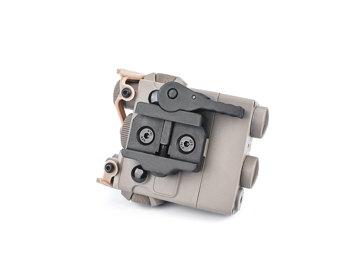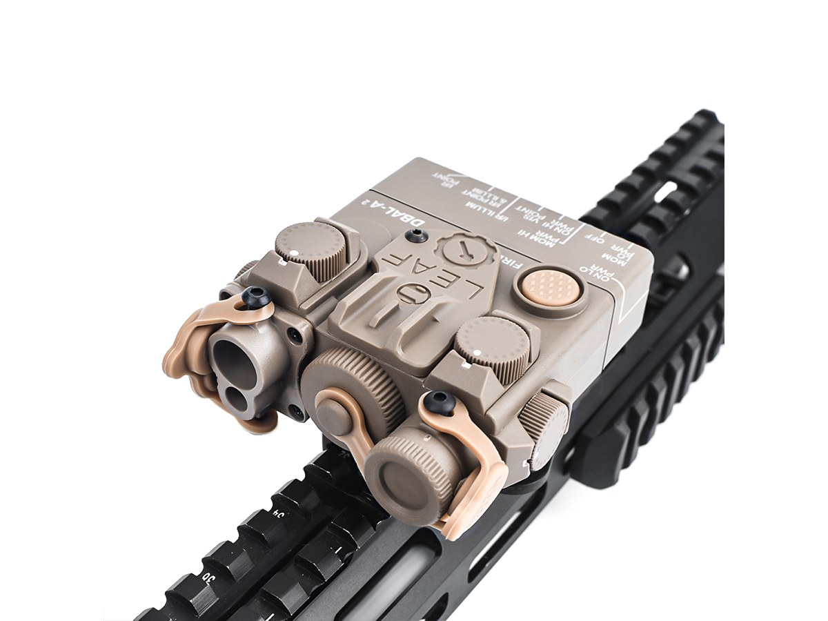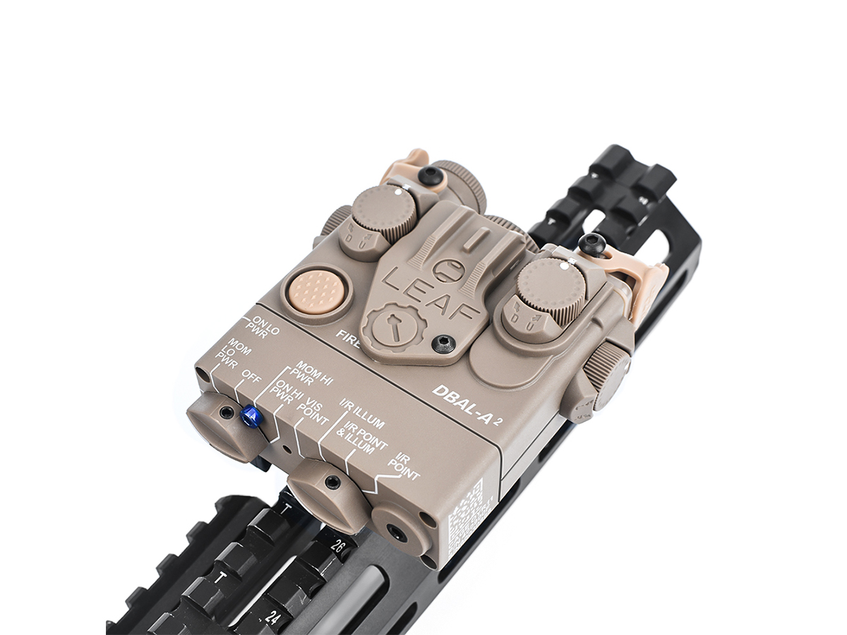 Acest produs oferit de WADSN are un rol strict ornamental. Este realizat din plastic ABS si imita modelul de punctator laser tactic DBAL A2. Producatorul a avut grija sa copieze toate briz-briz-urile dispozitivului real si marcajele aferente. In pachet exista chiar si un set de abtibilduri si separat in pachet prinderea LEAF.