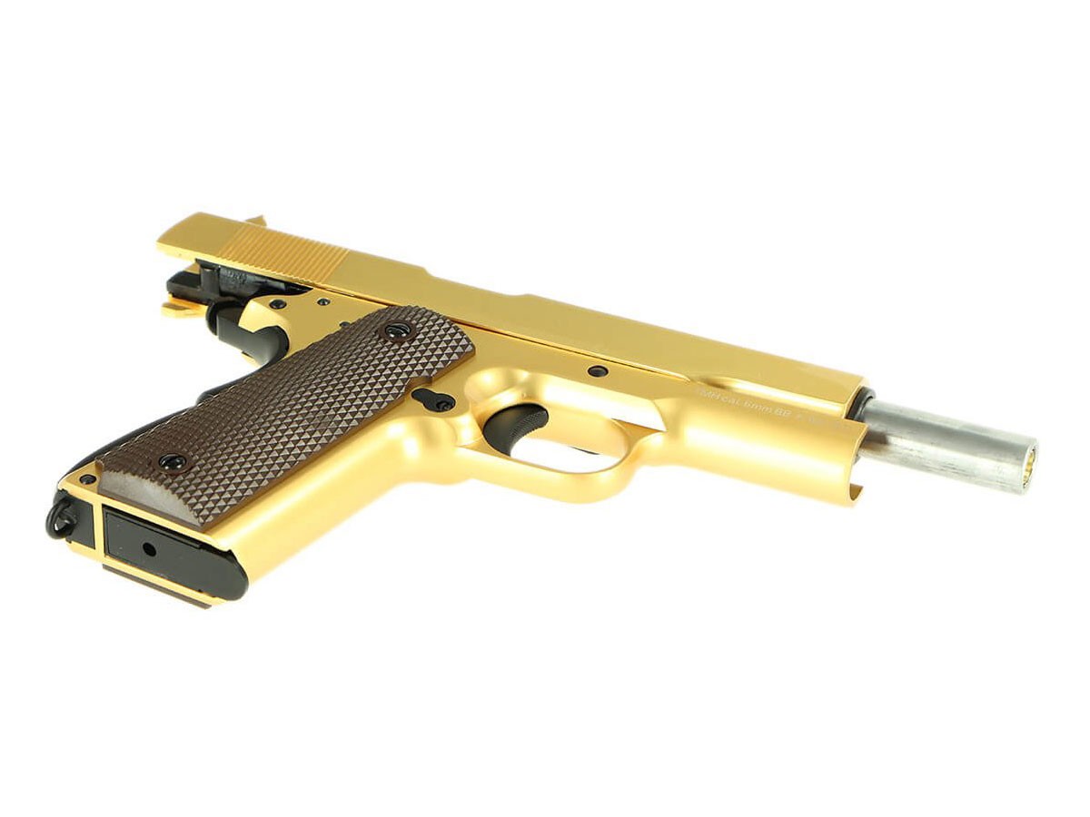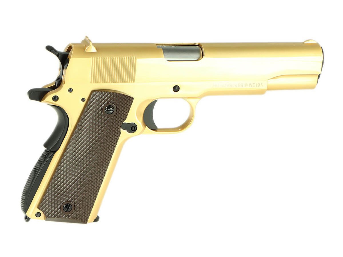 Replica WE 1911 Gold cu greu va putea trece neobservata pe un teren de airsoft. Corpul pistolului este fabricat in intregime din metal. Preselele sunt realizate din plastic ABS. Catarile replicii sunt fixe dar bine orientate. Asemenea armei adevarate replica este prevazuta o siguranta pe maner si inca una pentru cocos si manson. Funtionarea replicii este asemanatoare armei adevarate. Pentru actionare, mansonul va trebui armat mai intai pentru a alimenta prima bila pe teava si pentru a arma cocosul. De aici mai departe reculul actionat de gaz va rearma semi-automat fiecare foc.