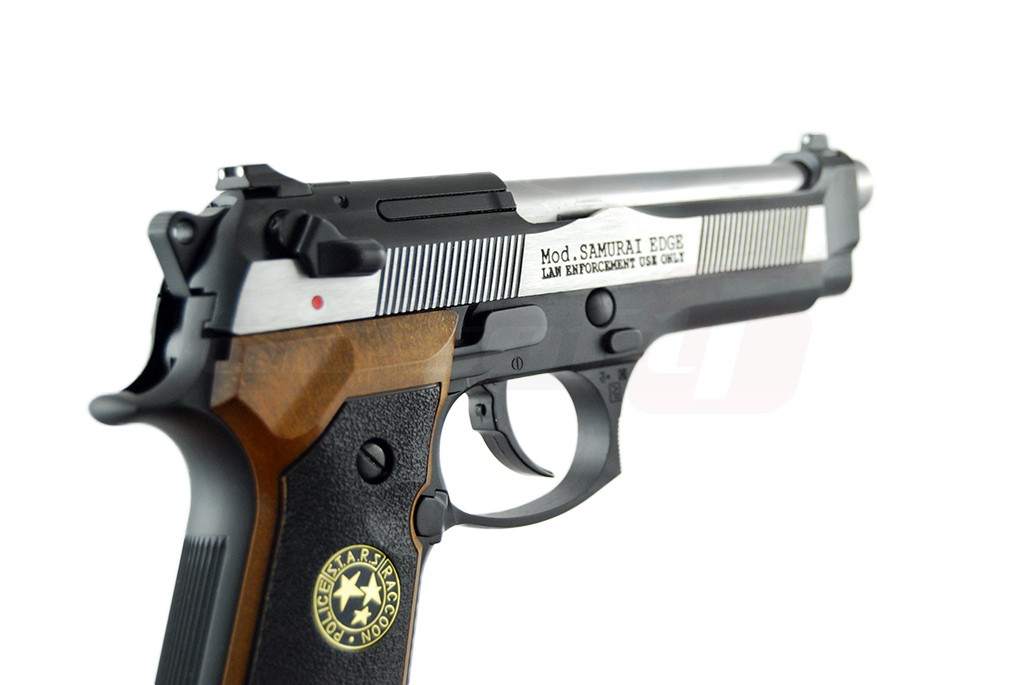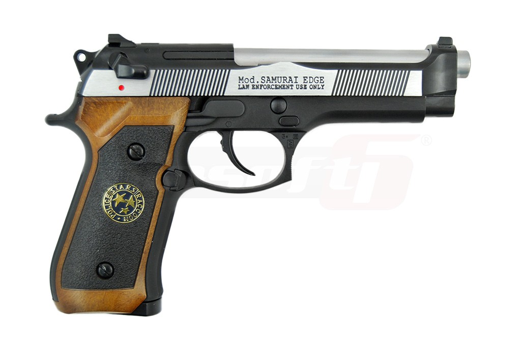 Producatorul WE reuseste sa copieze destul de bine aceasta arma fictiva si odata ce o exploatam, exista sansa ca un usor zambet sa ne surada involuntar. Este realizata din metal fapt ce pune amprenta pe autenticitate fata de arma reala. Toate insemnele specifice S.T.A.R.S. sunt unde trebuie. Preselele de culoare maronie trec greu neobservate iar functionarea pe baza de CO2 este pur si simplu un vis devenit realitate, permitand exploatarea replicii si atunci cand temperatura mediului ambiant este scazuta. Comenzile sunt standard Beretta M9. In partea frontala existand levierul pentru demontarea mansonului. In partea din spate a mansonului exista siguranta ambidextra iar in stanga manerului butonul pentru eliberarea incarcatorului.