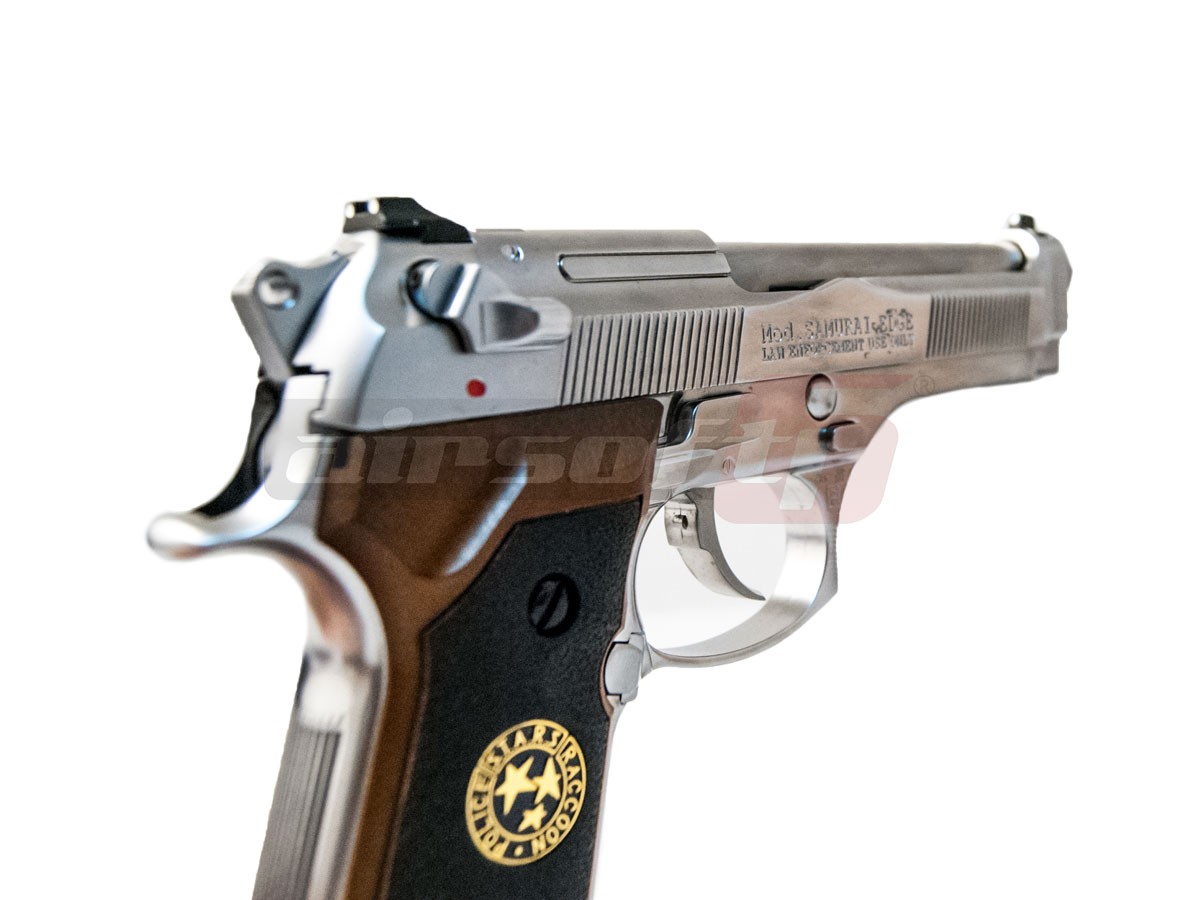 Producatorul WE reuseste sa copieze destul de bine aceasta arma fictiva si odata ce o exploatam, exista sansa ca un usor zambet sa ne surada involuntar. Este realizata din metal fapt ce pune amprenta pe autenticitate fata de arma reala. Toate insemnele specifice S.T.A.R.S. sunt unde trebuie. Preselele de culoare maronie trec greu neobservate iar functionarea pe baza de CO2 este pur si simplu un vis devenit realitate, permitand exploatarea replicii si atunci cand temperatura mediului ambiant este scazuta. Comenzile sunt standard Beretta M9. In partea frontala existand levierul pentru demontarea mansonului. In partea din spate a mansonului exista siguranta ambidextra iar in stanga manerului butonul pentru eliberarea incarcatorului.