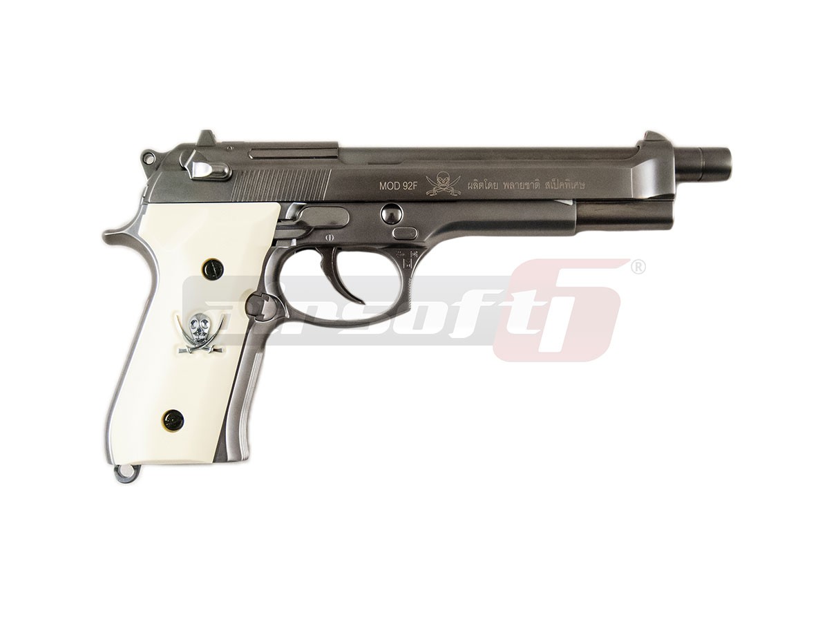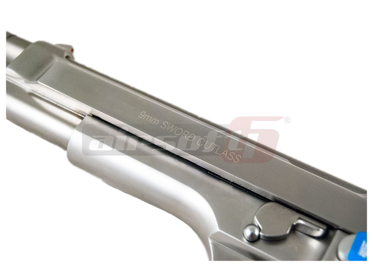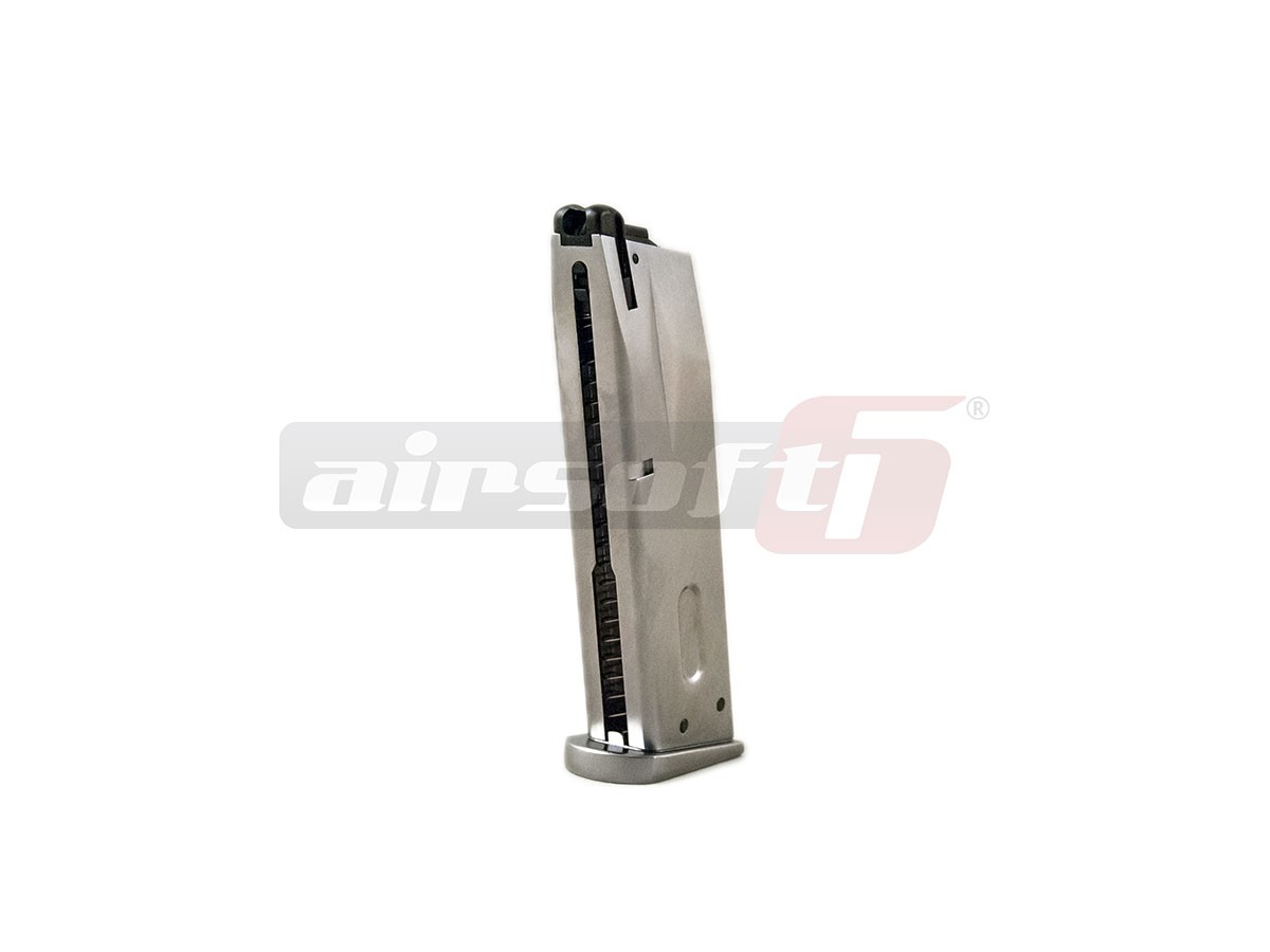 Aceasta replica de airsoft prezentata este fabricata de catre WE iar fata de modelele clasice este mai lung si prezinta o culoare argintie, oferindu-i un aer rafinat dar totodata performante imbunatatie. Este fabricat din metal iar finisajul este bun. Reculul pistolului utilizand green gaz este semnificativ, senzatia oferita in timpul exploatarii este deosebita. Siguranta replicii de airsoft este asemenea pistolului adevarat ambidextra. Mag catch-ul este pozitionat in partea stanga, deasemenea si slide catch-ul. Designul ofera pistolului un aer extravagant ce va atrage privirile curiosilor.