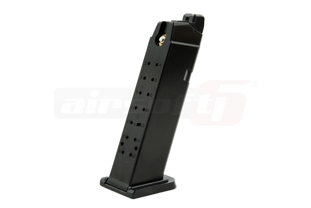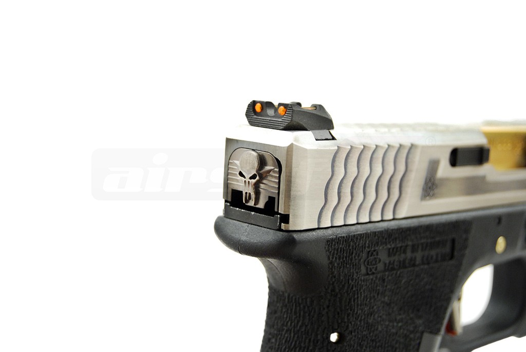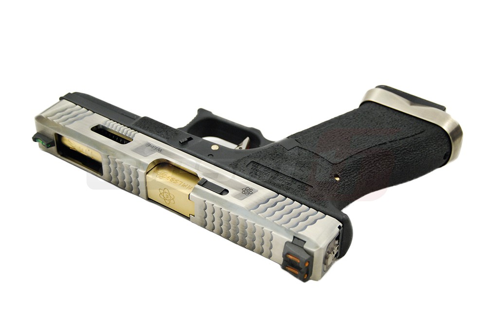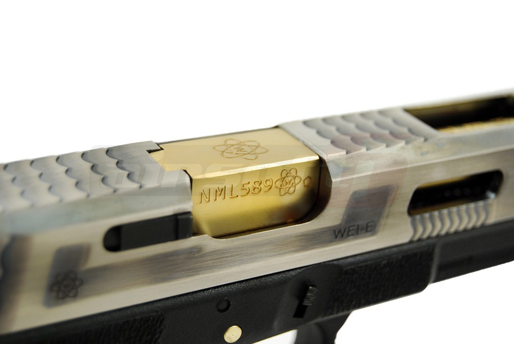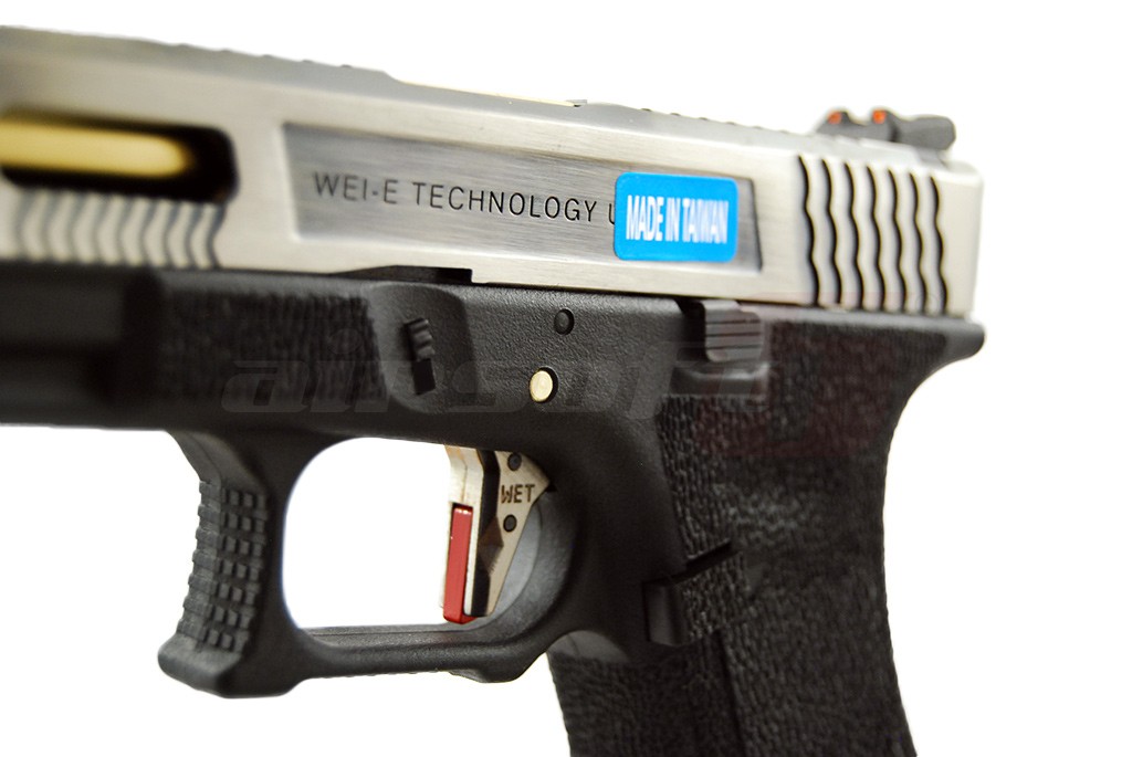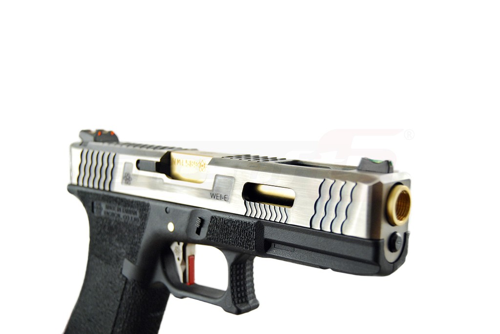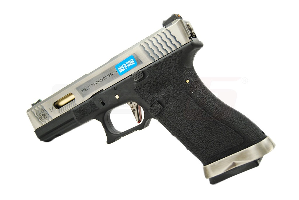 Aceasta replica este fabricata de WE, si copiaza generatia a treia a G17, varianta modificata pentru tir sportiv. Partea inferioara este fabricata din nylon si prezinta in partea manerului o textura menita sa ofera o aderenta imbunatatita. Mansonul sau partea superioara este fabricata din aliaj de aluminiu si prezinta un design deosebit cu un finisaj argintiu. Bravurile de pe manson, in afara de aspectul placut pe care il ofera au si scop practic, oferind o prindere ferma atunci cand este armat. Sistemul de ochire este fix dar este prevazut cu elemente luminiscente pentru a tinti mai usor. Teava externa este deasemenea din metal si este prevazuta in partea frontala cu filet pentru a putea fixa un amortizor extern. In partea inferioara a manerului exista un adaptor metalic ce usureaza introducerea incarcatorului in pistol.