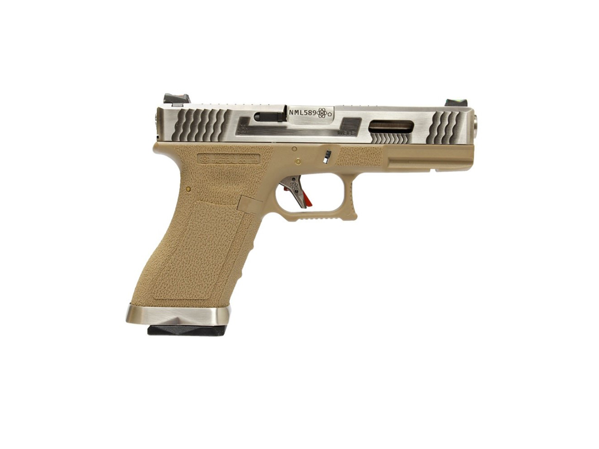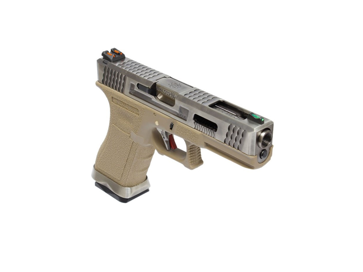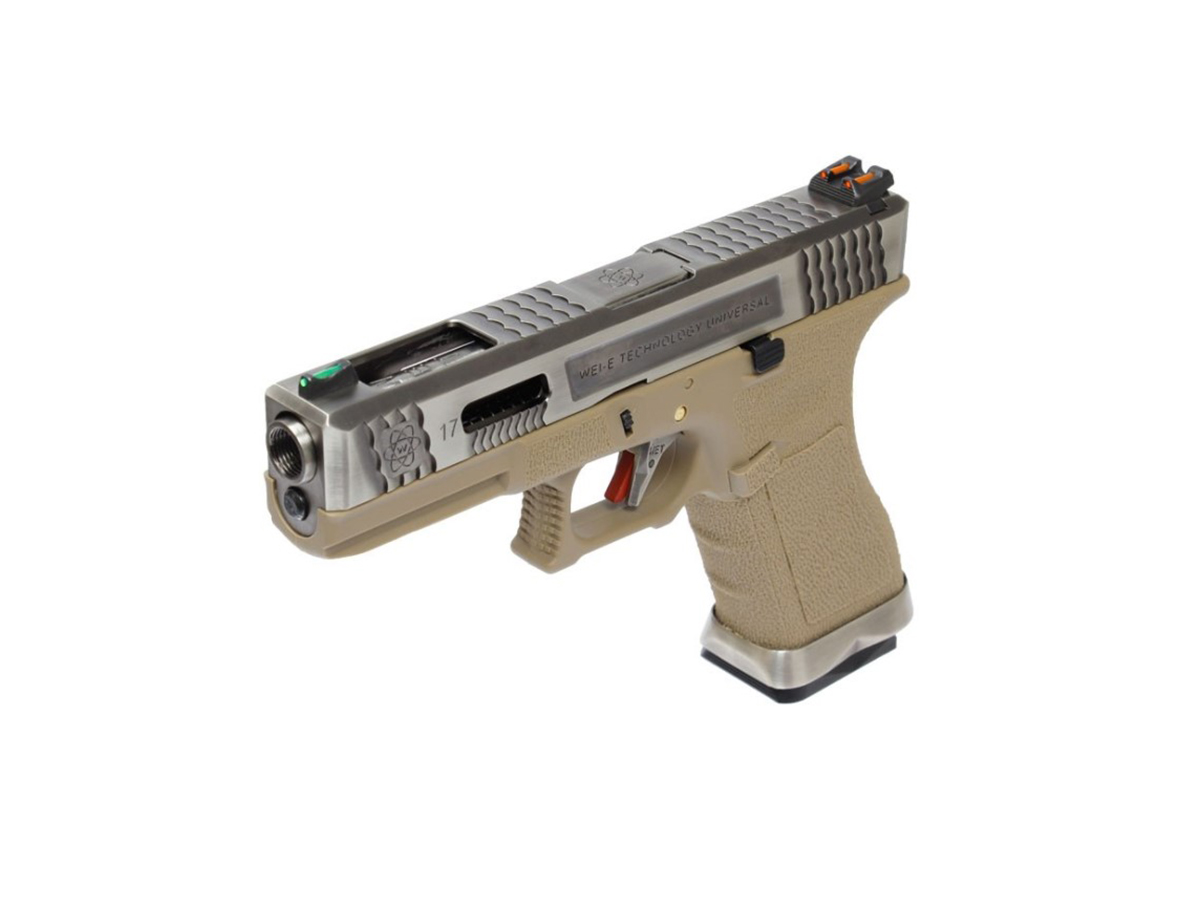 Aceasta replica este fabricata de WE, si copiaza generatia a treia a G17, varianta modificata pentru tir dinamic. Partea inferioara este fabricata din nylon si prezinta in partea manerului o textura menita sa ofera o aderenta imbunatatita. Mag well-ul metalic va permite abuzul procedurii de inlocuire a incarcatorului. Mansonul sau partea superioara este fabricata din aliaj de aluminiu si prezinta un design deosebit. Bravurile de pe manson, in afara de aspectul placut pe care il ofera au si scop practic, oferind o prindere ferma atunci cand este armat. Sistemul de ochire este fix dar este prevazut cu elemente luminiscente pentru a tinti mai usor. Teava externa este deasemenea din metal si este prevazuta in partea frontala cu filet pentru a putea fixa un amortizor extern.