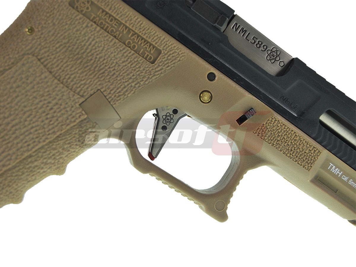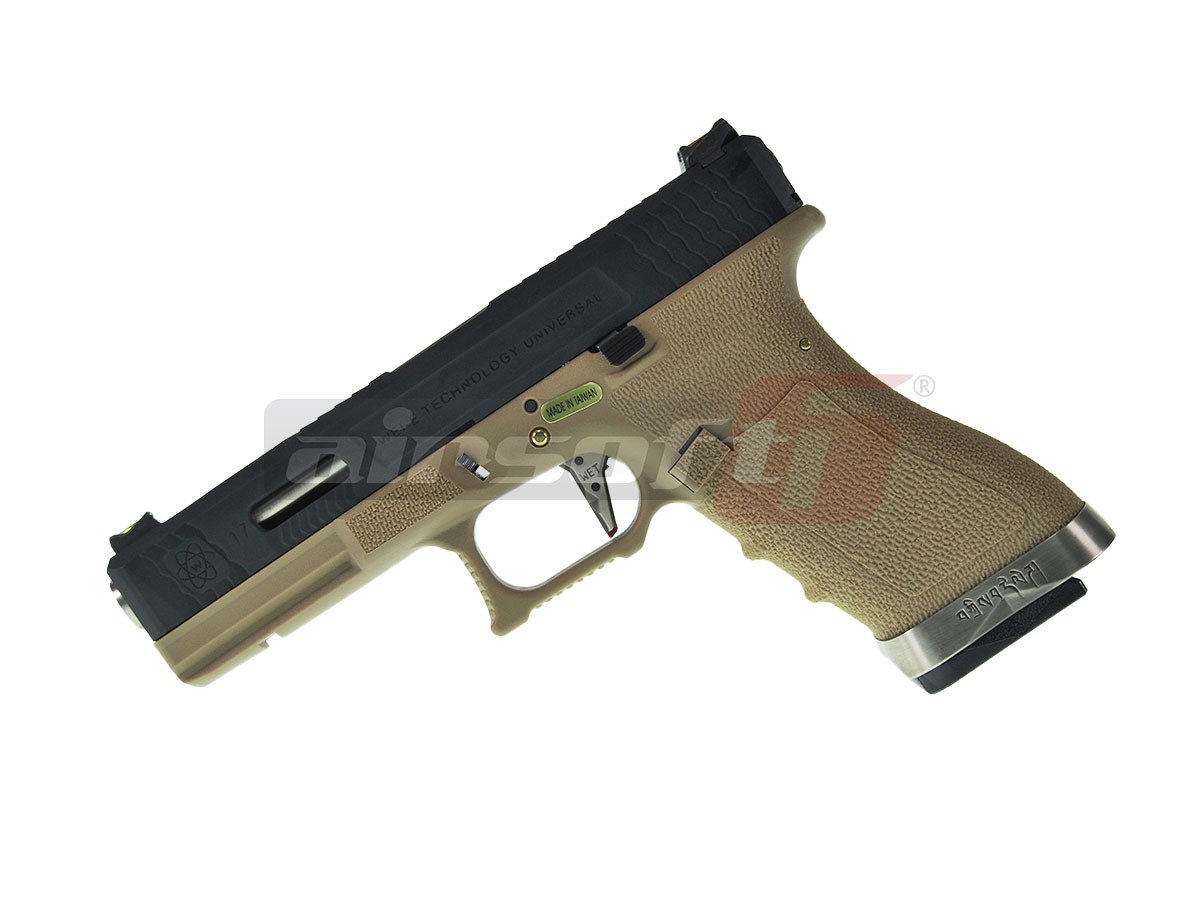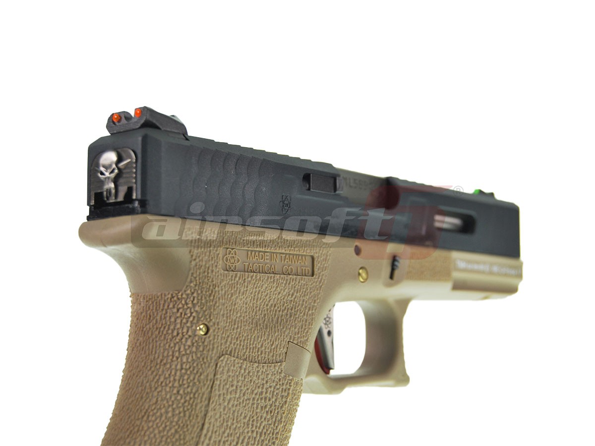 Aceasta replica este fabricata de WE, si copiaza generatia a treia a G17, varianta modificata pentru tir sportiv. Partea inferioara este fabricata din nylon si prezinta in partea manerului o textura menita sa ofera o aderenta imbunatatita. Mansonul sau partea superioara este fabricata din aliaj de aluminiu si prezinta un design deosebit cu un finisaj argintiu. Bravurile de pe manson, in afara de aspectul placut pe care il ofera au si scop practic, oferind o prindere ferma atunci cand este armat. Sistemul de ochire este fix dar este prevazut cu elemente luminiscente pentru a tinti mai usor. Teava externa este deasemenea din metal si este prevazuta in partea frontala cu filet pentru a putea fixa un amortizor extern. In partea inferioara a manerului exista un adaptor metalic ce usureaza introducerea incarcatorului in pistol.
