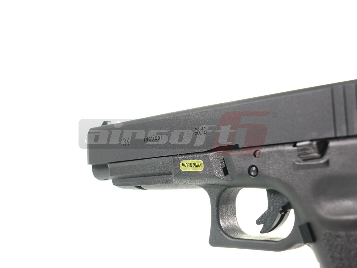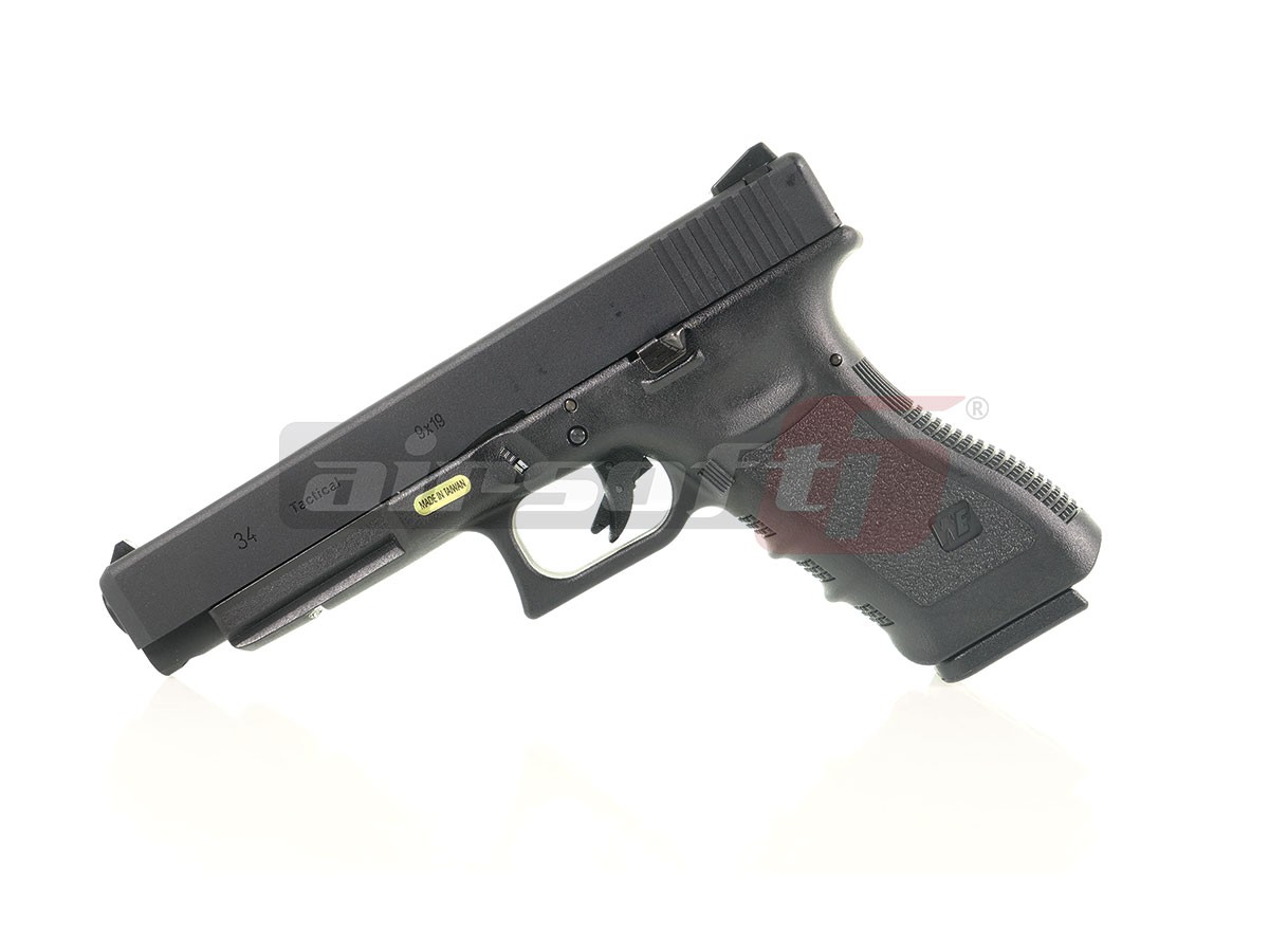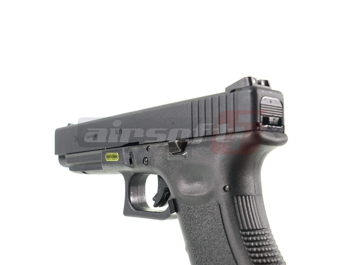 Aceasta replica este fabricata de WE, si copiaza generatia a treia a G34 Partea inferioara este fabricata din nylon si prezinta in partea manerului o textura menita sa ofera o aderenta imbunatatita. Mansonul sau partea superioara este fabricata din aliaj de aluminiu. Bravurile de pe manson, in afara de aspectul placut pe care il ofera au si scop practic, oferind o prindere ferma atunci cand este armat. Teava externa este deasemenea din metal si este prevazuta in partea frontala cu filet pentru a putea fixa un amortizor extern.