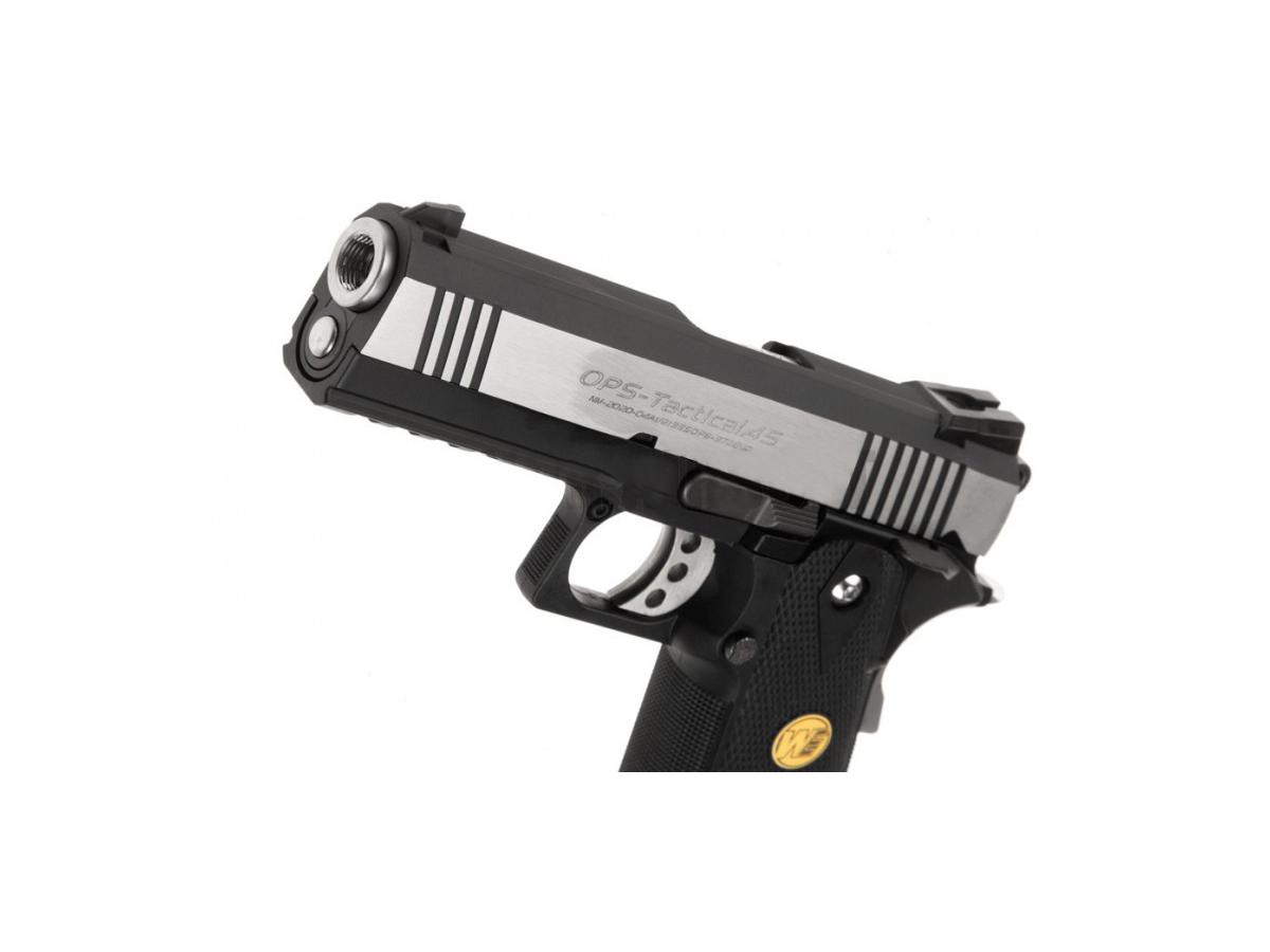 WE replica cu mici modificari STI 2011 tactical 4.0. Este construit in intregime din metal si toate elementele specifice hicapa sunt unde trebuie sa fie, piedica activa situata pe maner si siguranta pentru cocos, specifice clasicului 1911. Un avantaj oferit de acest design este ca odata avariata o anumita componenta aceasta poate fi inlocuita individual datorita multitudinii de piese existente pe piata.
