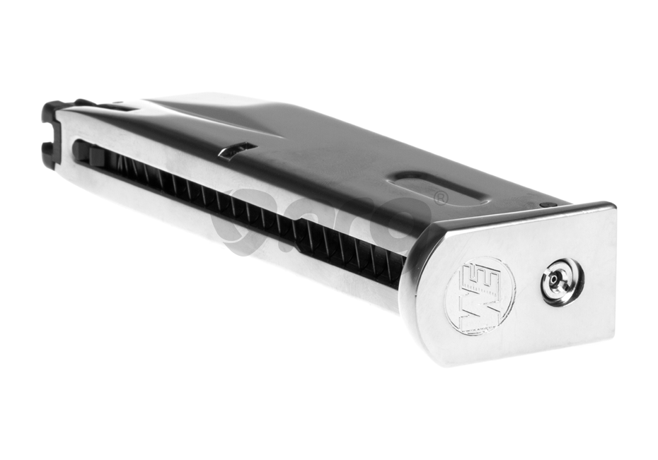 Incarcator produs de catre WE pentru platforma M9. Acest incarcator poate fi folosit cu gaz Green Gas sau alte variante de gaz cu propietati asemanatoare.Este construit din metal iar gura de alimentare cu bile este din plastic.