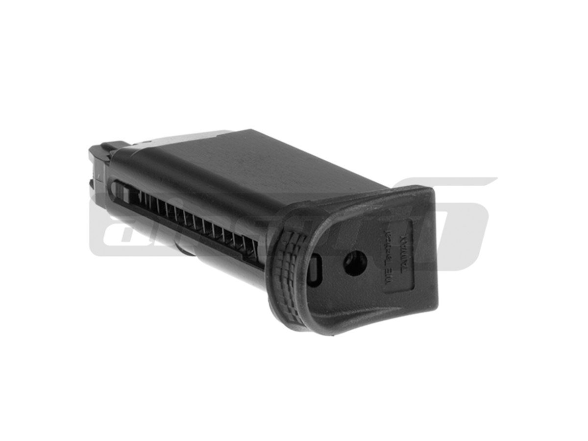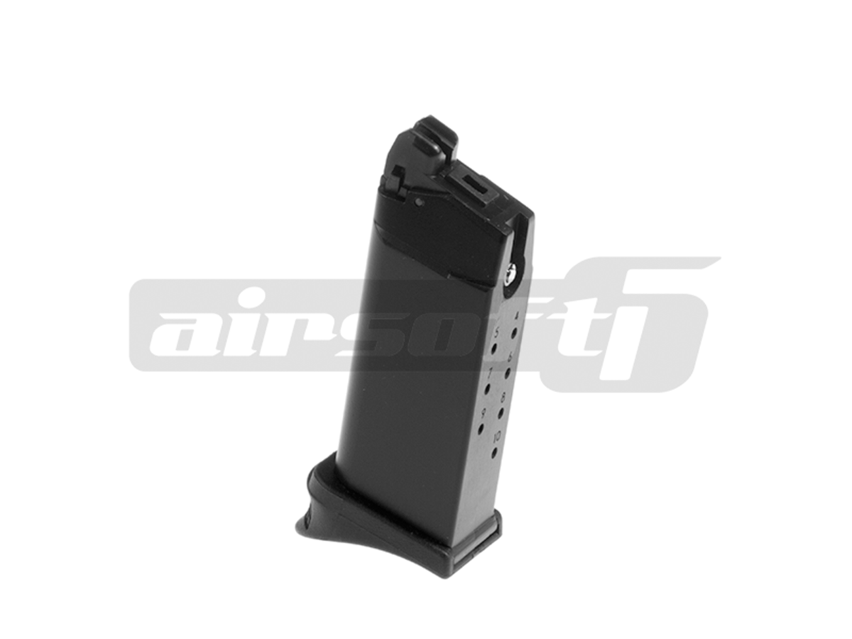 Incarcator produs de catre WE pentru pistoalele de airsoft seria G27. Acest incarcator poate fi folosit cu gaz Green Gas sau alte variante de gaz cu propietati asemanatoare. Este construit din metal iar gura de alimentare cu bile este din plastic. Capacitatea incarcatorului este de 15 de bile de 6mm.