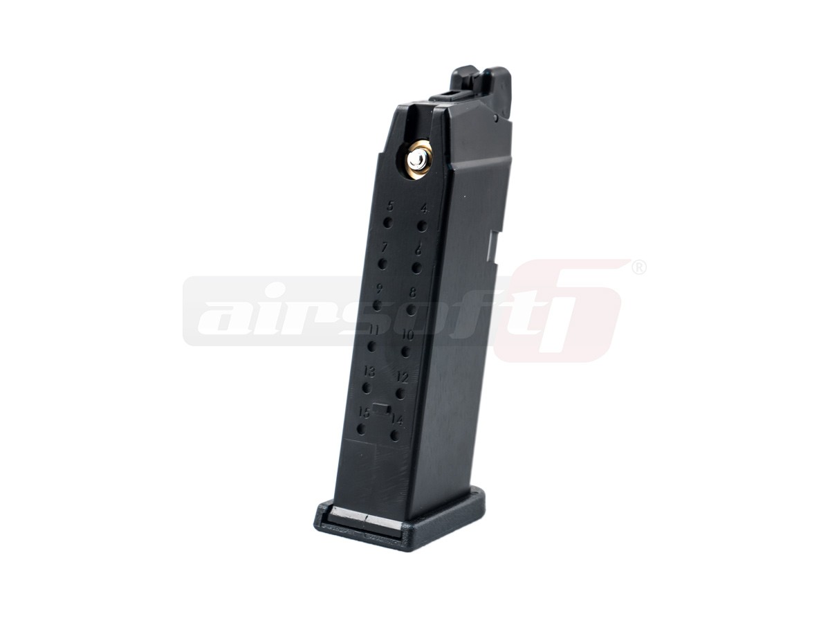 Incarcator produs de catre WE pentru pistoalele de airsoft seria G19/23. Acest incarcator poate fi folosit cu gaz Green Gas sau alte variante de gaz cu propietati asemanatoare.Este construit din metal iar gura de alimentare cu bile este din plastic. Capacitatea incarcatorului este de 19 de bile de 6mm.