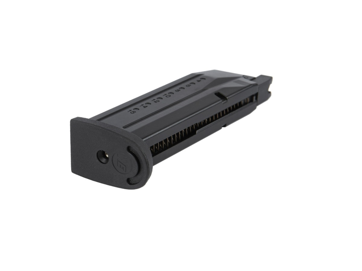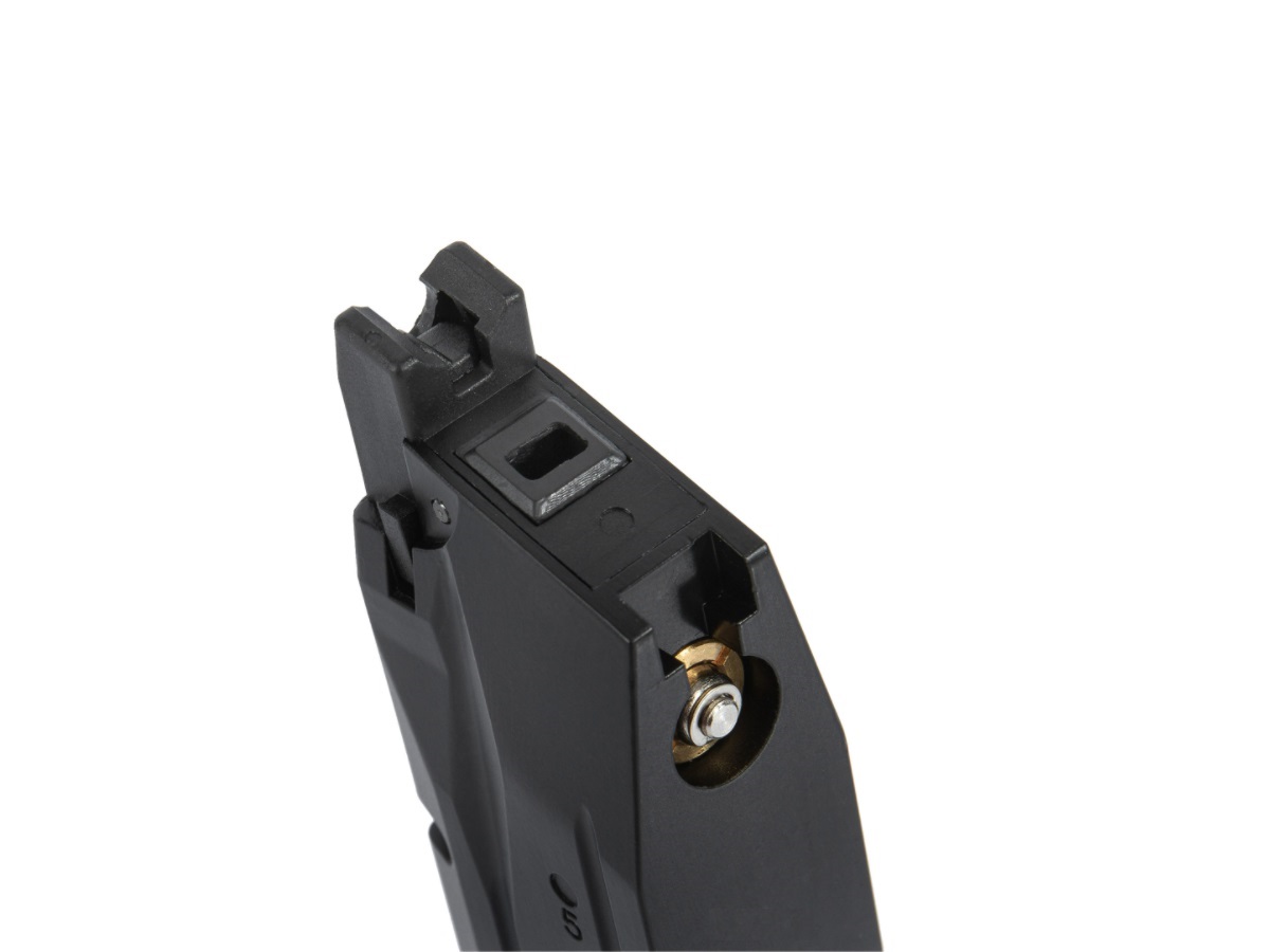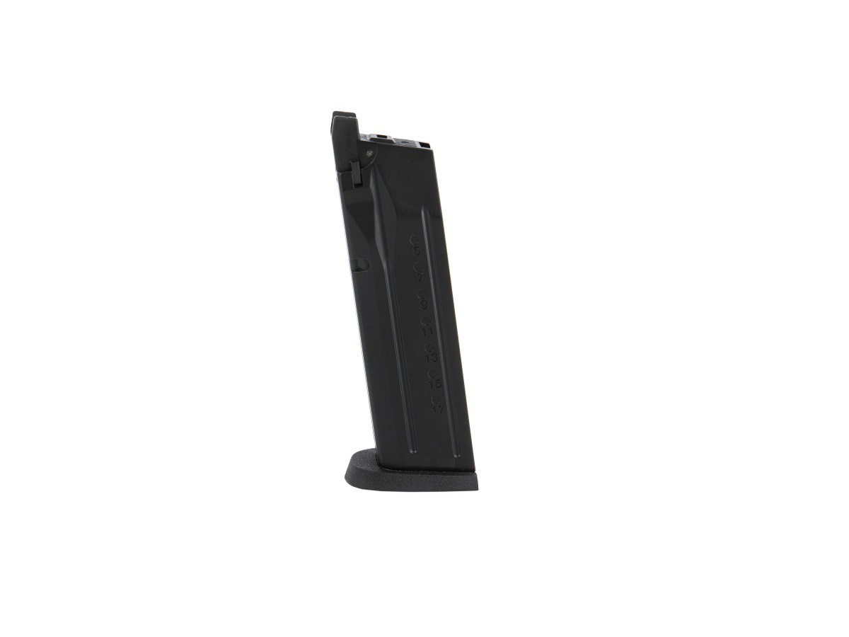 Incarcator produs de catre WE pentru pistoalele de airsoft seria M&P sau WET-05. Acest incarcator poate fi folosit cu Green Gas sau alte variante de gaz cu propietati asemanatoare. Este construit din metal iar gura de alimentare cu bile este din plastic. Capacitatea incarcatorului este de 21 de bile de 6mm.