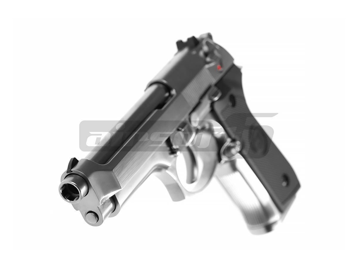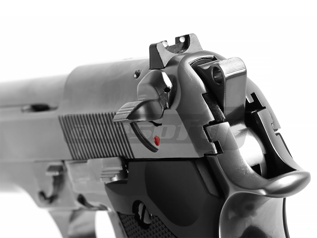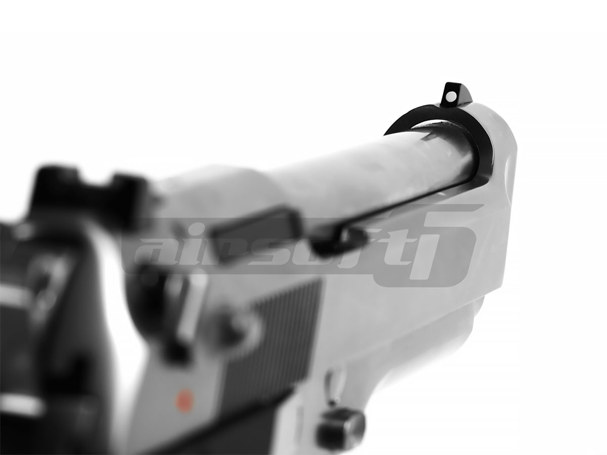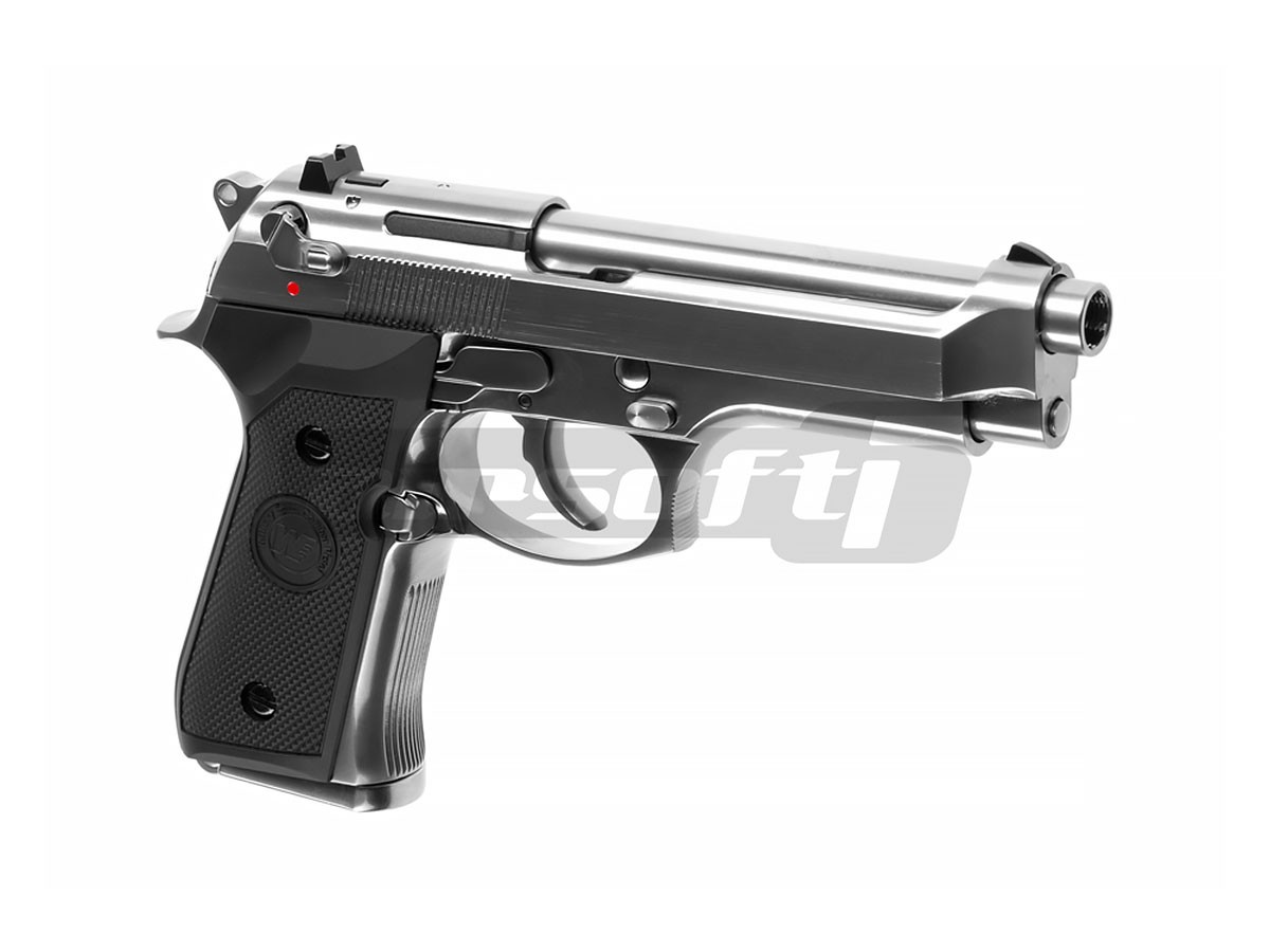 Aceasta replica de airsoft prezentata este fabricata de catre WE model M9, oferindu-i un aer agresiv dar totodata performante imbunatatite. Este fabricat din metal de calitate iar finisajul este bun. Reculul pistolului utilizand green gaz este semnificativ, senzatia oferita in timpul exploatarii este deosebita. Siguranta replicii de airsoft este asemenea pistolului adevarat ambidextra. Mag catch-ul este pozitionat in partea stanga, deasemenea si slide catch-ul.