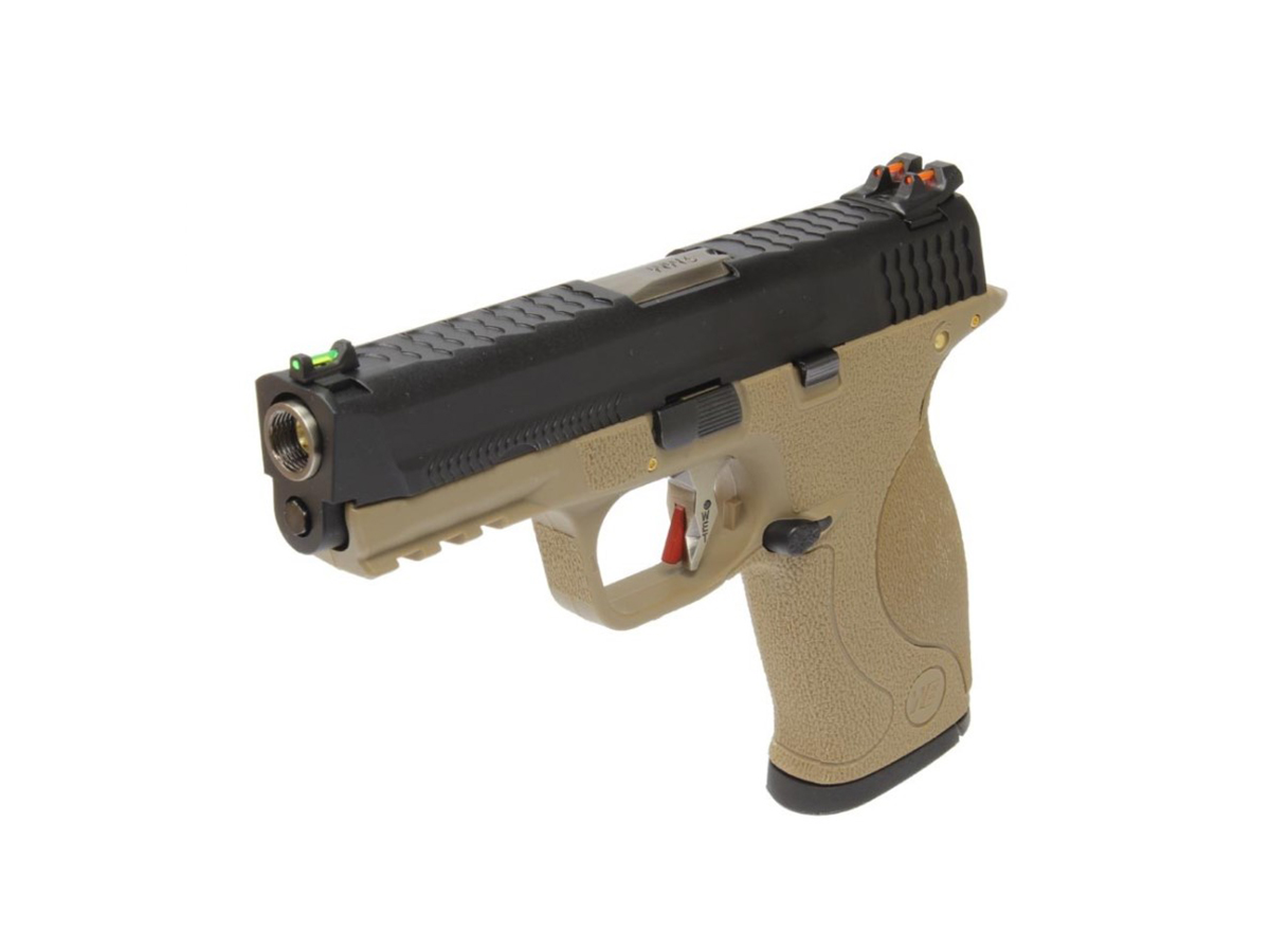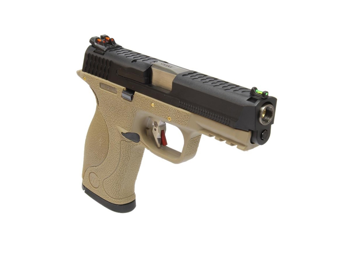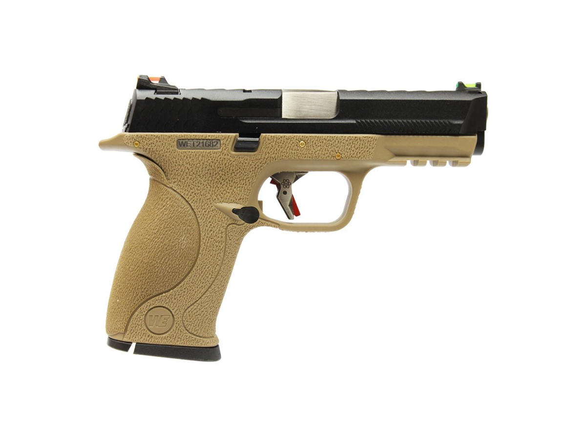 Replica de fata este comercializata de WE si copiaza destul de bine arma adevarata. Principiul de functionare este asemanator armei adevarate, gazul evacuat din incarcator actioneaza mansonul, creand recul ce la randul sau armeaza mecanismul intern si alimenteaza cu bila pentru urmatorul toc. Partea superioara sau mansonul este realizat din metal iar partea inferioara sau manerul este realizat din plastic ABS. Slide catch-ul replicii este ambidextru iar mag catch-ul si butonul pentru demontare sunt pe partea stanga. In partea frontala exista o sina standard pe care vor putea fi montate accesorii tactice. Partea din spate a manerului permite inlocuirea preselei cu una dintre cele 5 existente in pachet, pentru a optimiza marimea manerului dupa preferinte.