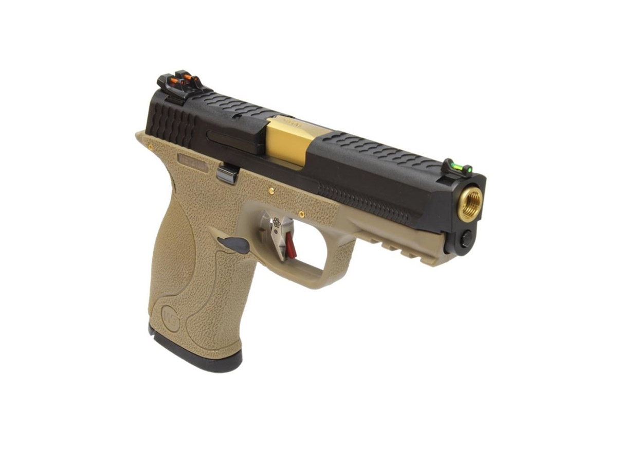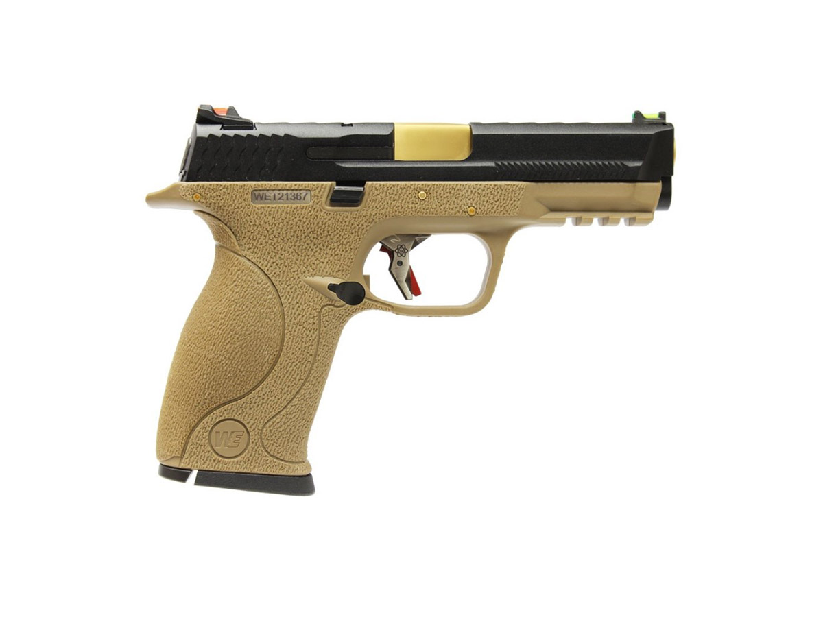 Replica de fata este comercializata de WE si copiaza destul de bine arma adevarata. Principiul de functionare este asemanator armei adevarate, gazul evacuat din incarcator actioneaza mansonul, creand recul ce la randul sau armeaza mecanismul intern si alimenteaza cu bila pentru urmatorul toc. Partea superioara sau mansonul este realizat din metal iar partea inferioara sau manerul este realizat din plastic ABS. Slide catch-ul replicii este ambidextru iar mag catch-ul si butonul pentru demontare sunt pe partea stanga. In partea frontala exista o sina standard pe care vor putea fi montate accesorii tactice. Partea din spate a manerului permite inlocuirea preselei cu una dintre cele 5 existente in pachet, pentru a optimiza marimea manerului dupa preferinte.