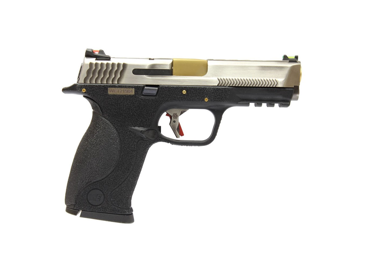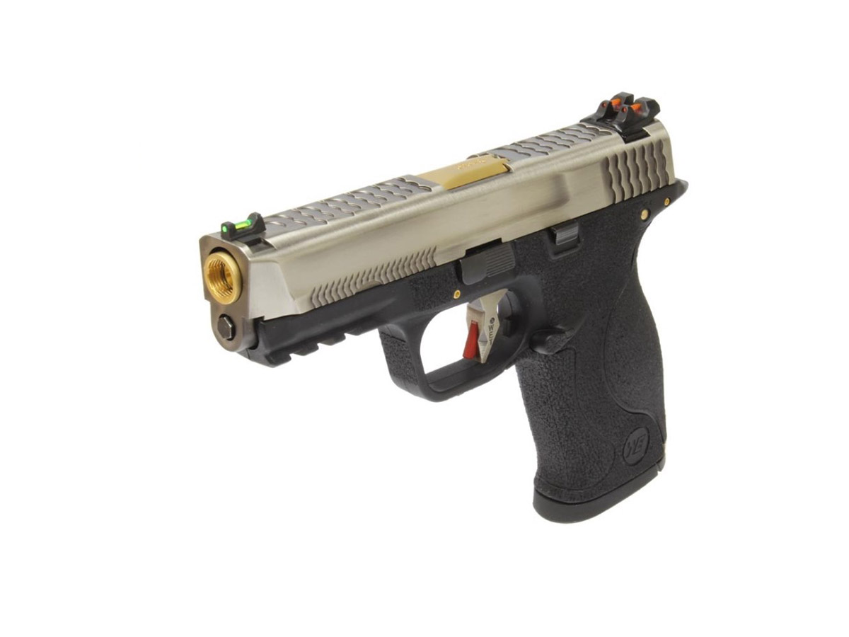 Replica de fata este comercializata de WE si copiaza destul de bine arma adevarata. Principiul de functionare este asemanator armei adevarate, gazul evacuat din incarcator actioneaza mansonul, creand recul ce la randul sau armeaza mecanismul intern si alimenteaza cu bila pentru urmatorul toc. Partea superioara sau mansonul este realizat din metal iar partea inferioara sau manerul este realizat din plastic ABS. Slide catch-ul replicii este ambidextru iar mag catch-ul si butonul pentru demontare sunt pe partea stanga. In partea frontala exista o sina standard pe care vor putea fi montate accesorii tactice. Partea din spate a manerului permite inlocuirea preselei cu una dintre cele 5 existente in pachet, pentru a optimiza marimea manerului dupa preferinte.